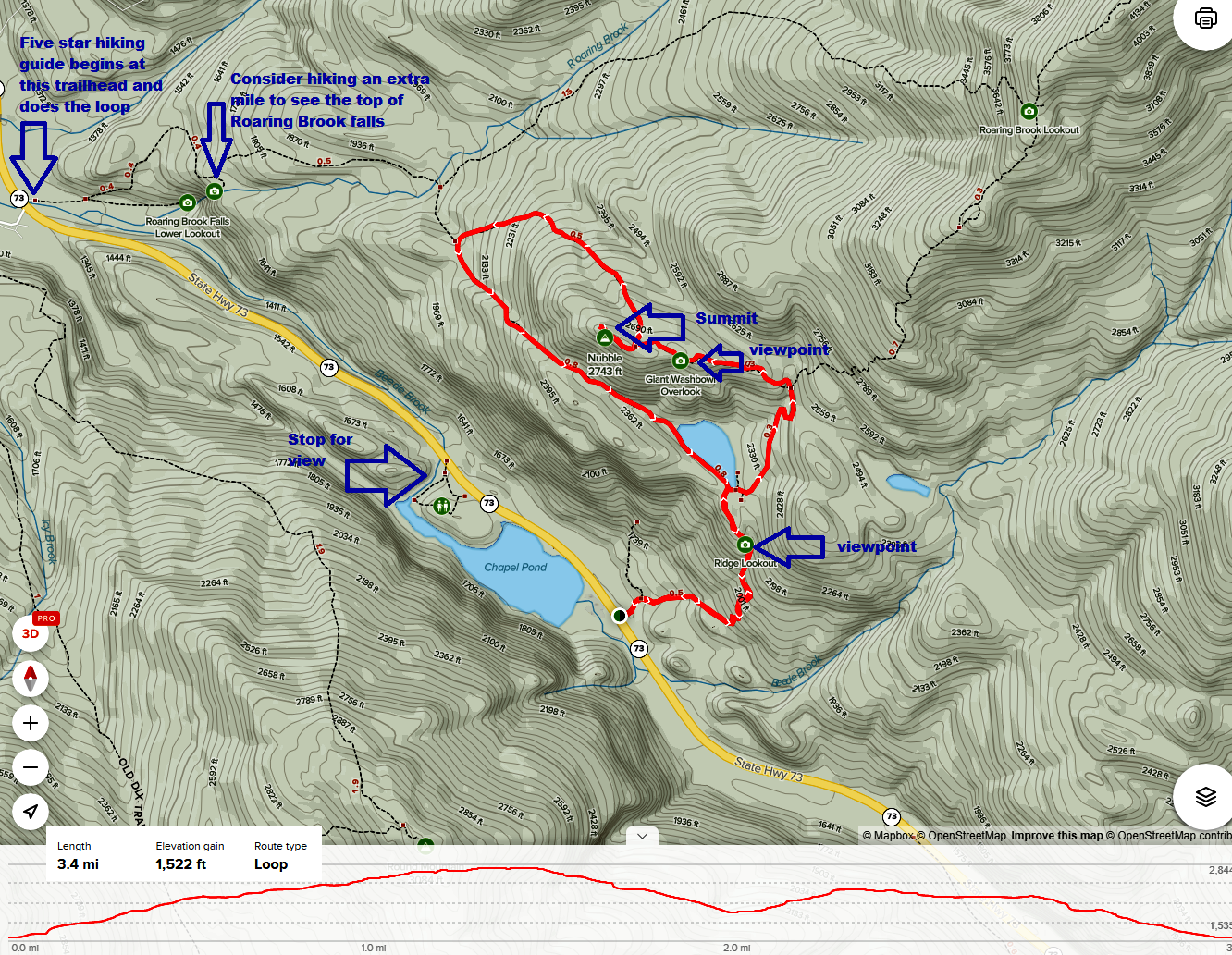 From this spot, the trail rises up slightly one final time for the final climb onto Little Crow’s summit. The area is unmarked and less spacious than Big Crow, but the vantage allows for a more expansive view to the east. Drive 11 miles, 0.3 hrs, from Big Crow to Giant's Nubble and Roaring Brook Falls Trailhead The Five Star Trail hiking book rates Giant Nubble 5 stars for scenery and 4 stars for difficulty. Note that we are going to Giant Nubble and not to Giant Mountain (which has same trailhead). Giant Mountain is one of the 46er summits, it is a 6 mile roundtrip with 3050' of elevation gain! Discover this 3.40 mile, loop trail near Keene Valley, New York. Generally considered a challenging route, it takes an average of 2 h 24 min to complete. This is a popular trail for hiking, trail running, and walking, but you can still enjoy some solitude during quieter times of day. If you like walking through a combination of beautiful forests, rocky outcrops, and the shores of a beautiful little pond, you might like this hike! This trail is an extension of the out and back Nubble Trail. If you choose to do this loop here are a few things to note. There is heavy tree cover for much of the way heading north after getting to the Nubble Summit, so you won't have a ton of expansive views as you do on the way from Giant's Washbowl to the summit. As you head north, the trail descends fairly far down, so you will have to ascend some again to get back up to Giant's Washbowl heading south. This trail might be pretty challenging if you have knee or balance problems, particularly on the descents. Giant Nubble and Roaring Brook Falls. Drive 4.75 hrs, 256 miles, from Giant's Nubble trailhead to the Lakeside Inn in Reading This is the same trailhead used for the Ausable River Loop hike