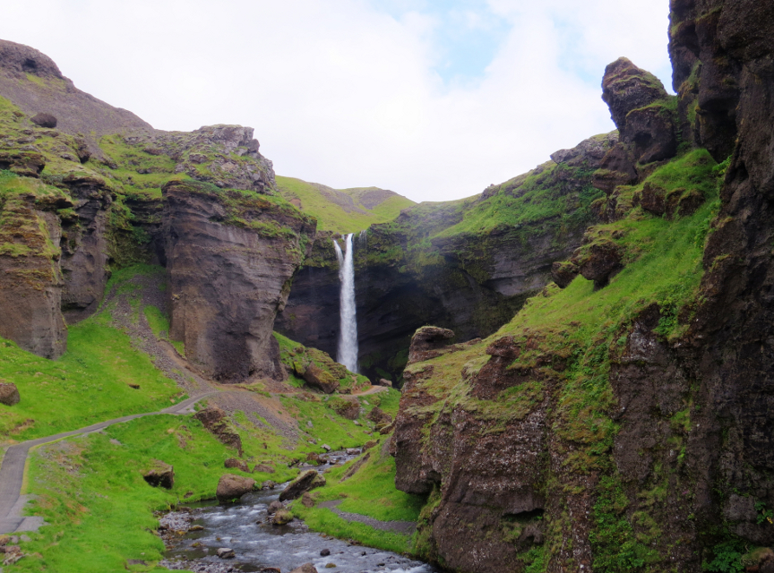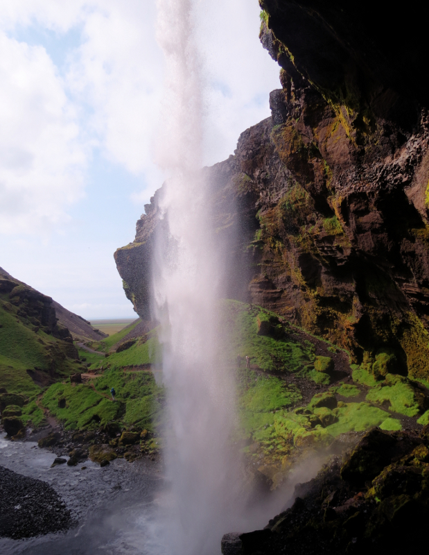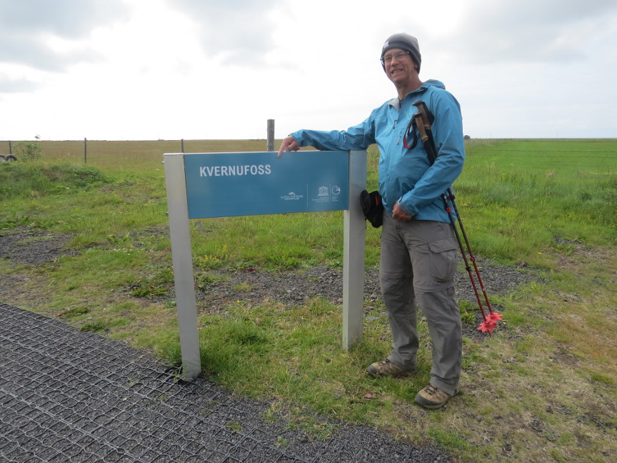 There was a short 2 Km walk to the nearby Kvernufoss, which is one of the waterfalls that you can walk behind. We left our heavy packs at Hotel Skógá and walked over to have a look. It is indeed an impressive waterfall. Kvernufoss is 98 feet tall, and is in a narrow Kvernugil gorge carved by the Kverna river. There