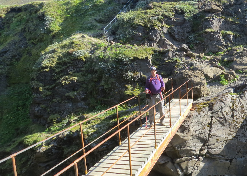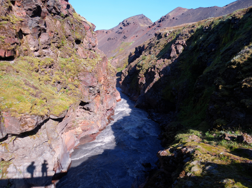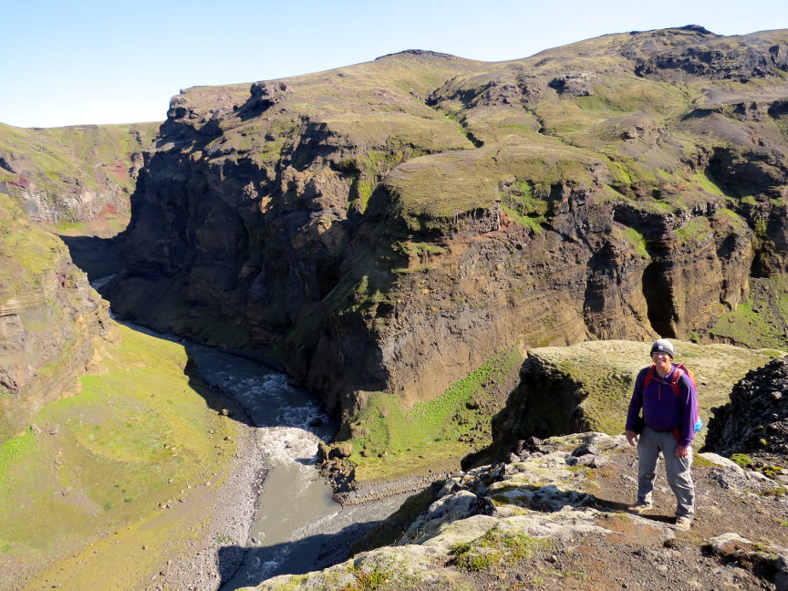There is a small stream that can be stepped across immediately after leaving Emstrur. Then there is an unexpectedly steep downhill that took us down to the bridge over the Fremri-Emstruá river. We climbed back up the other side of the river valley and found ourselves on a broad flat plateau - this was the open area we had seen the previous evening when we did the side hike from Emstrur out to see the Markarfljótsgljúfur. We knew that there was a short side trail that led to an overlook of the confluence, so of course we took that extra distance and were rewarded with a nice view down into the gorge. The Fremri-Emstruá river merges into the Markarfljót. Our trail paralleled the Markarfljót for much of today's hiking.