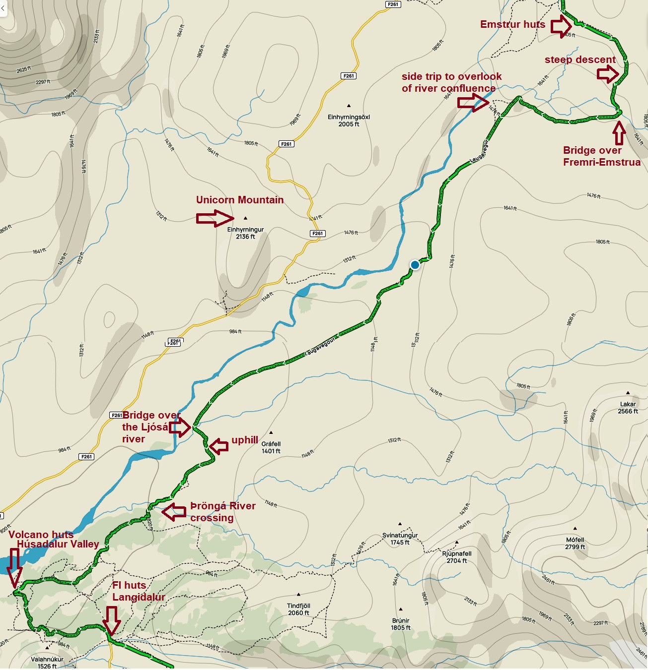 This stage doesn't have any long steep climbs, so it is an easy walk. The biggest obstacle on stage 4 is the crossing of the Þröngá river. We saw several online videos that told how the fast moving waters of the Þröngá were icy cold