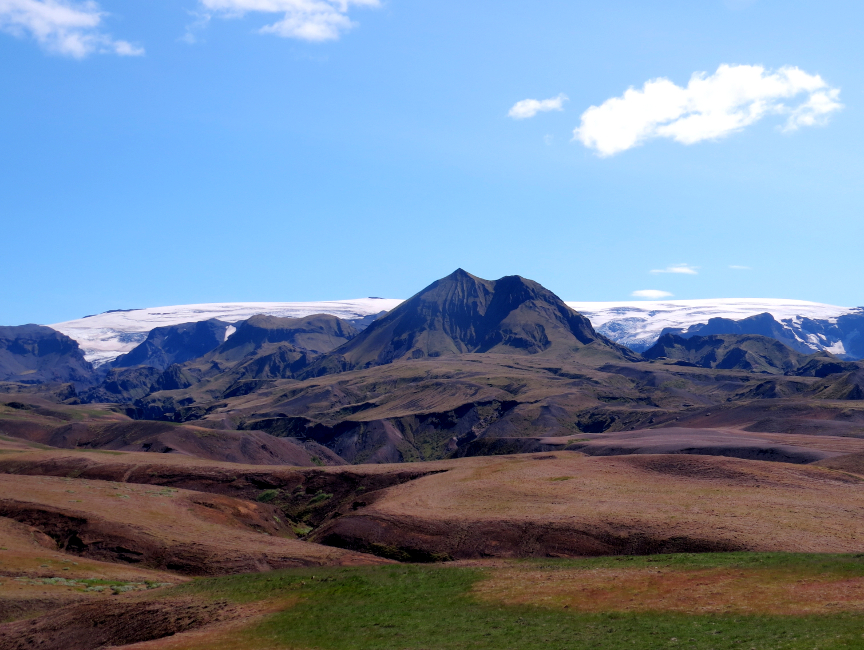 Because we had clear weather, all day we could see the big glaciers of Mýrdalsjökull and Eyjafjallajökull. I knew that the Fimmvörðuháls trail went right between the two ice sheets, but I was unable to pick out where the trail exactly went up and over the mountain ridge.