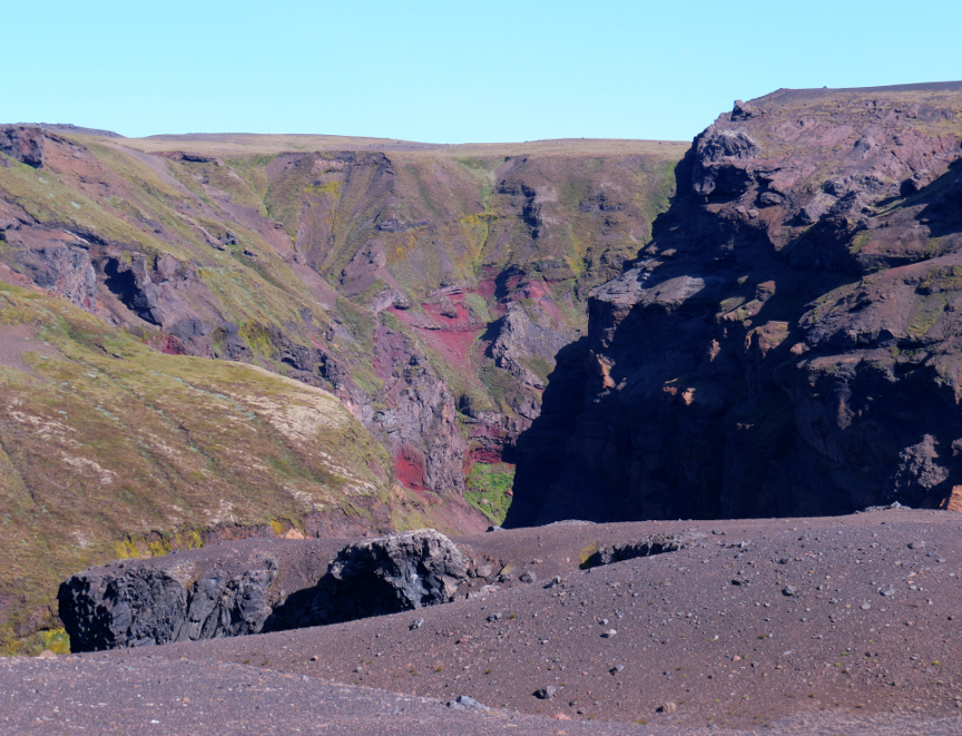 Fimmvörðuháls trail - Melanie wanted to hike the entire length, all 30 KM, in one day. We would be starting early and hiking late! We did, however, take the short 1.2 KM walk from Húsadalur to see the FI huts at Langidalur, and admire all the glaciers in the evening light. The Volcano huts at Þórsmörk are really nice. Showers are free, with unlimited water. We stayed in one of the sheep-herders cottages with Anthony and Anneka. The buffet dinner is marvelous! The fourth and final stage of the Laugavegur. At 15 Km, it is the longest of the four stages, but it is a varied and interesting scenic hike, with landmarks along the way.