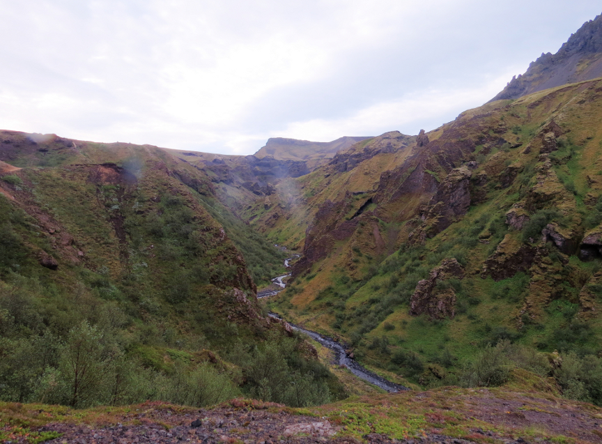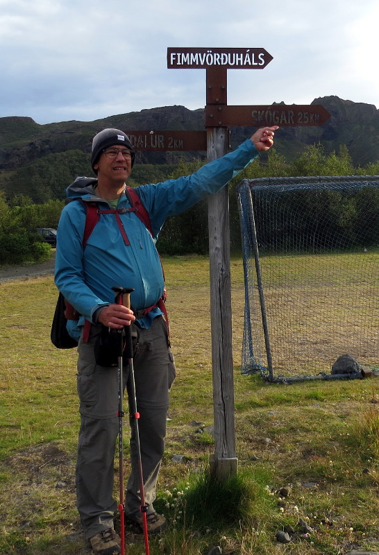 It is just 1.2 Km of easy hiking from Volcano huts to the FI hut at Langidalur. We stopped there to use the restrooms - but I forgot to pickup my pack afterwards! Perhaps I was subconsciously rebelling about carrying such a heavy load all day long. We were about to cross the bridge over the Krossá river when Melanie asked: "Where is your pack?" I had to run back and pick it up - that cost us about twenty minutes. Good thing we started early.