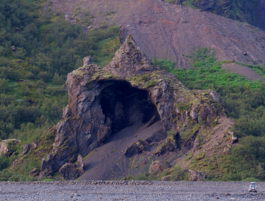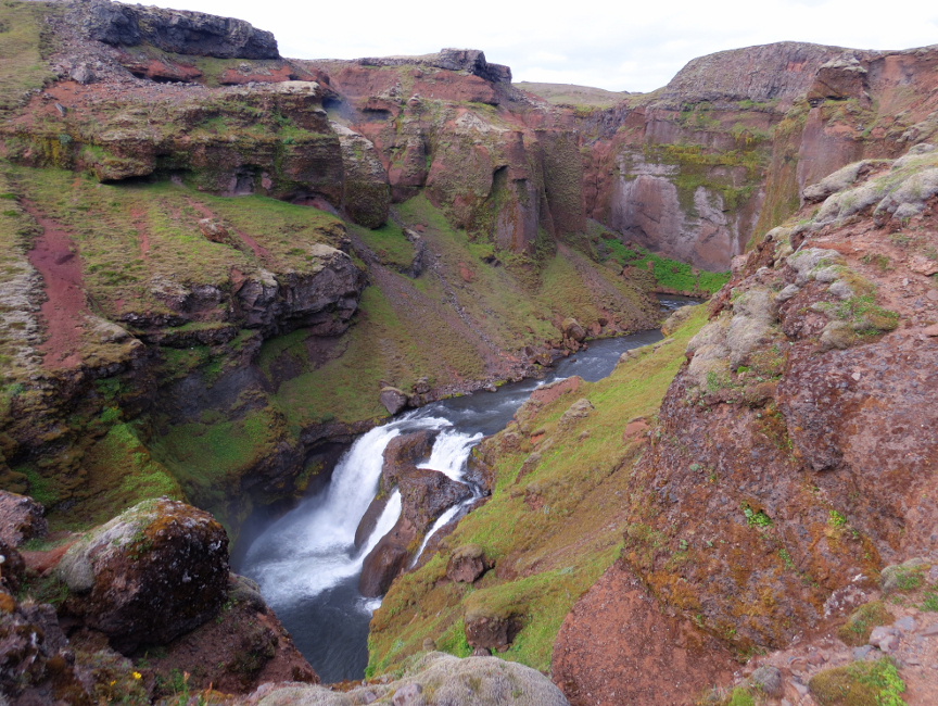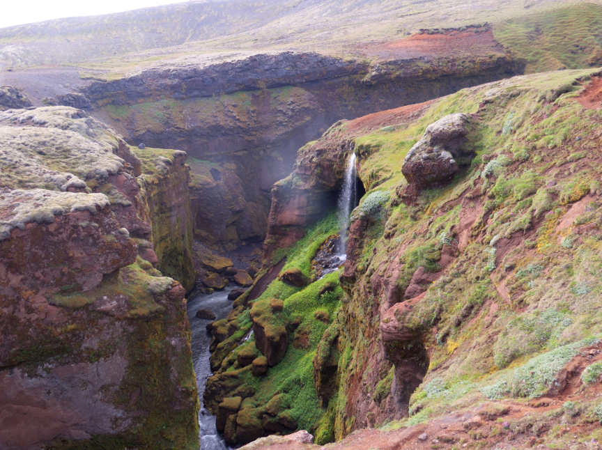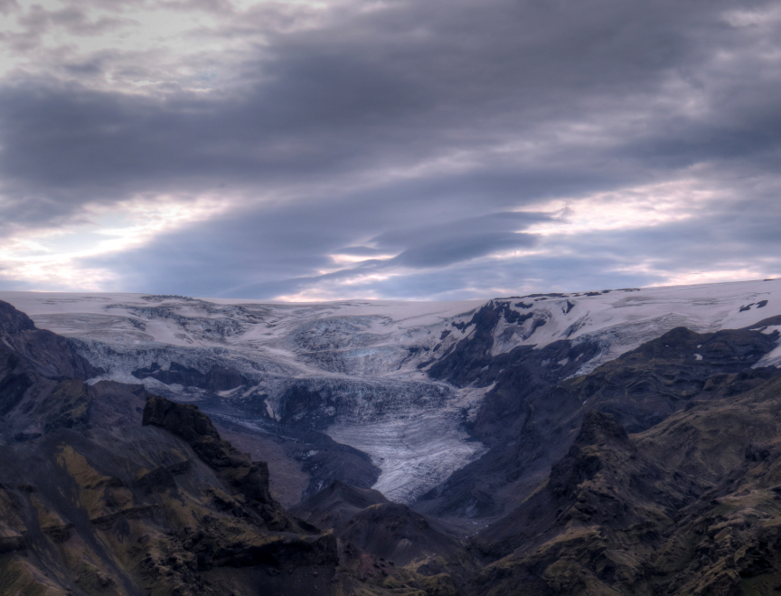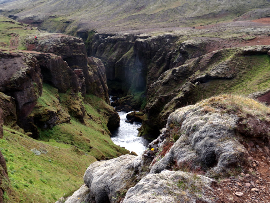 The Fimmvörđuháls starts climbing immediately after leaving Básar. We soon found ourselves in a wonderland of sculpted stones, steep ravines and even some arches. The rocks here must have been carved by the violent outflow of melted glaciers when volcanos erupt beneath the glacier ice. There is a short section famous for its scary appearance - the Kattarhryggir - which means the 'cat spine' - this stretch is only about 20 yards long, but there are steep drop offs on either side. I walked carefully through that part, always making sure one foot was firmly on the ground.