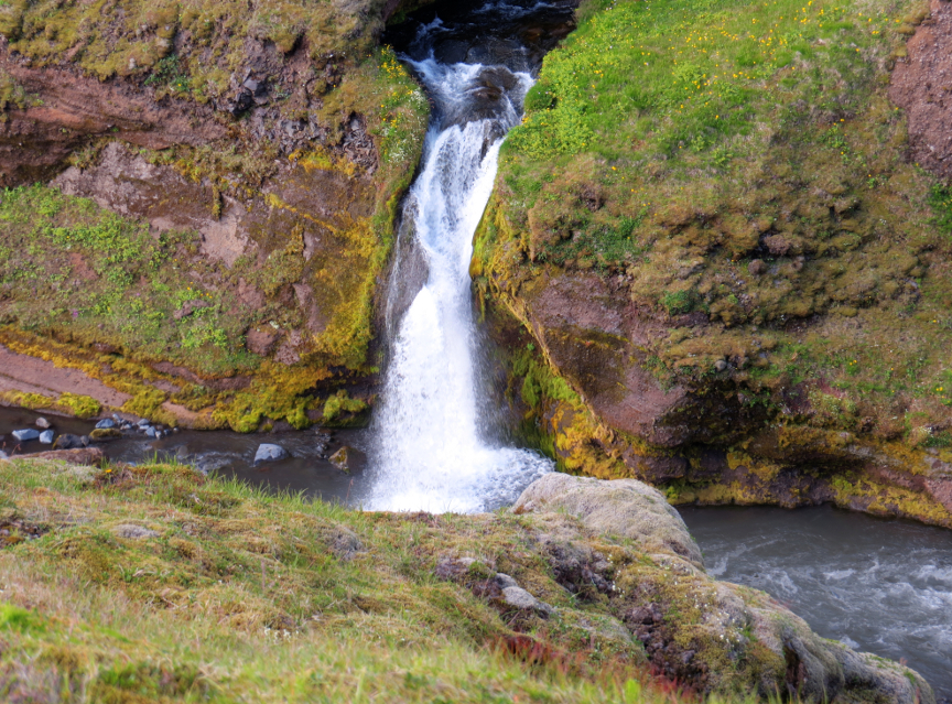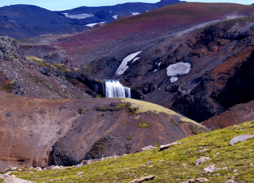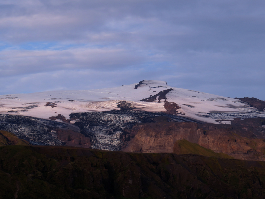 As predicted, the weather was ideal. We had views in all directions, able to see both glaciers, the Eyjafjallajökull on our right and the Mýrdalsjökull to the left. There was an impressive waterfall coming off of the Mýrdalsjökull and pouring into a deep gorge, visible from just off of the trail.