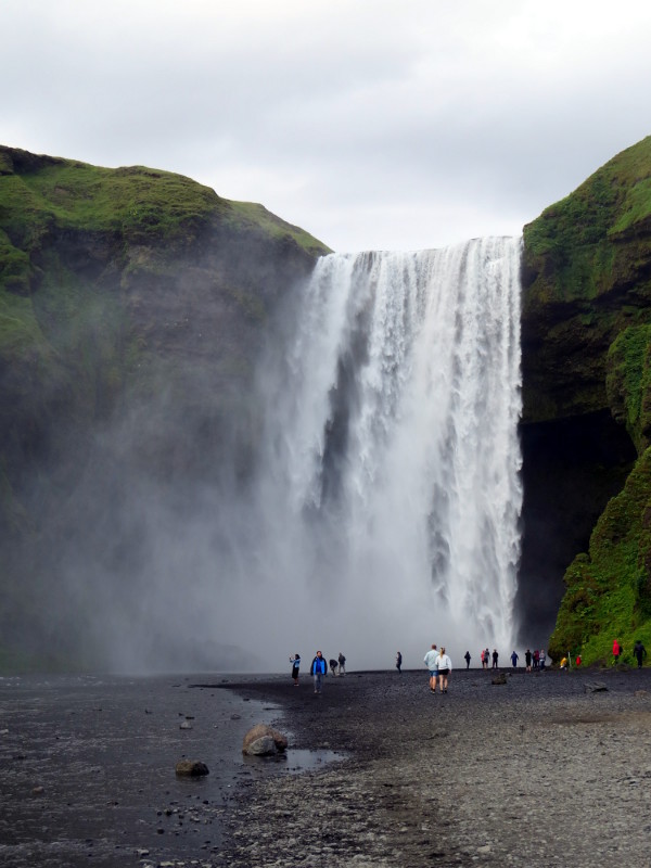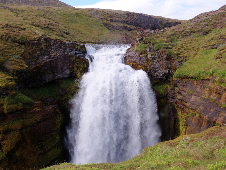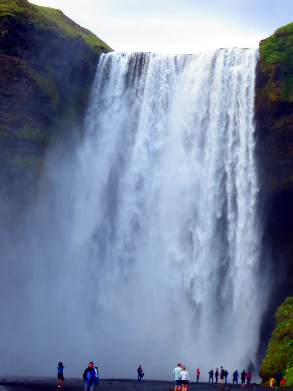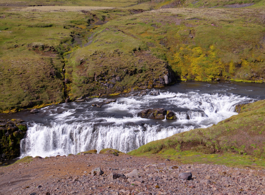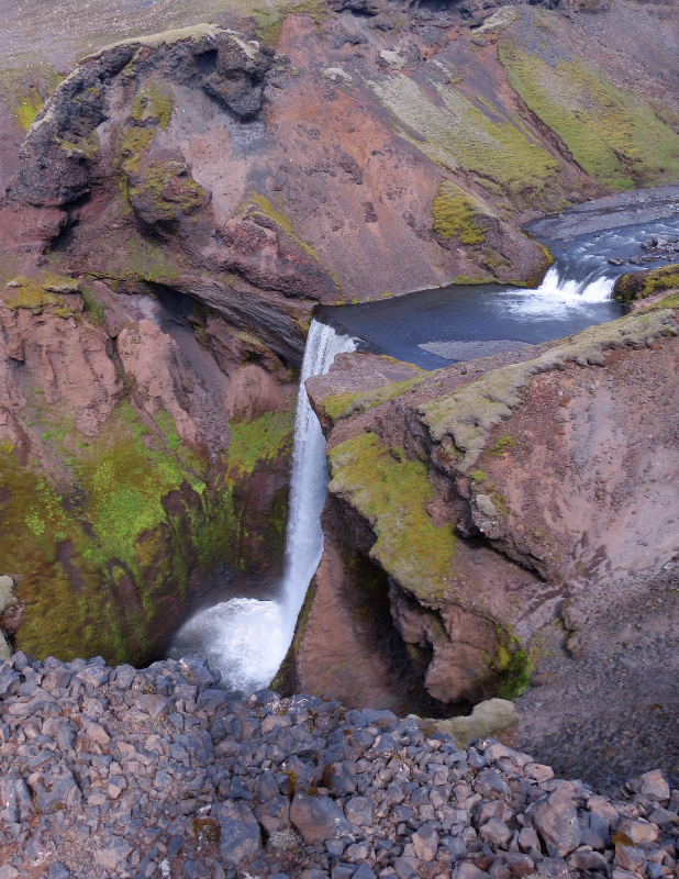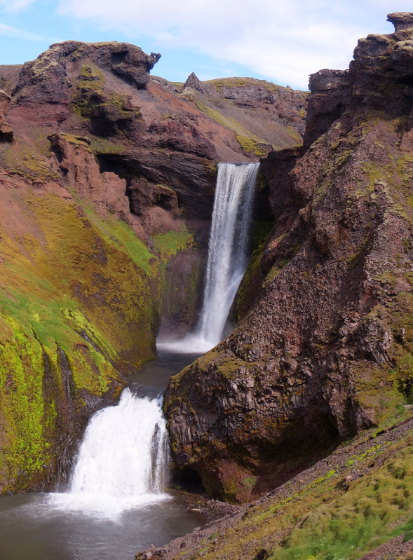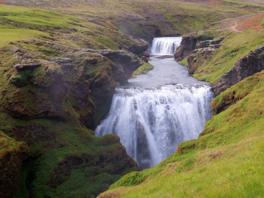 It is nine miles from the Baldvinsskáli hut down to Skógar, downhill all the way. The last 7.5 Km are famously known as the "Waterfall Way'. Depending on which websource you consult, there are 25, 26 or 27 waterfalls in that final 7.5 Km. The Fimmvörđuháls follows the flow of the Skóga river down to where it ends dramatically as the photogenic Skógafoss waterfall. I decided to take a picture of each of the waterfalls, in order to have a visual record of all these waterfalls. We stopped partway down for a snack, resting on the grass and admiring one of the more impressive falls. Only the last eight waterfalls are named, so the other falls can be assigned any fanciful name you can imagine.