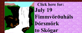 Day 8: Tuesday July 18Hike 10.1 miles (16.4 Km) to Þórsmörk Side jaunt during hike to see river confluence Stay at Volcano huts in Þórsmörk Room: Sheepherder's hut Food: yes. Showers: yes |