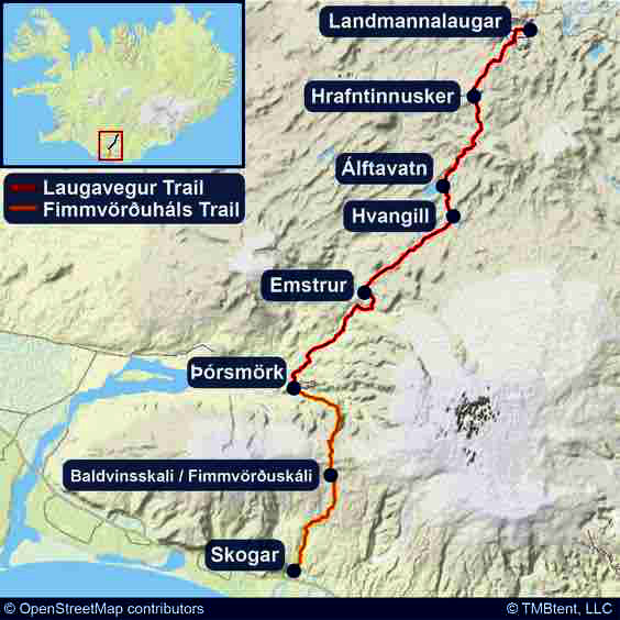 Here is the route map of the 55 Km Laugavegur (in red) and the 30 Km Fimmvörðuhál (in orange) trails: