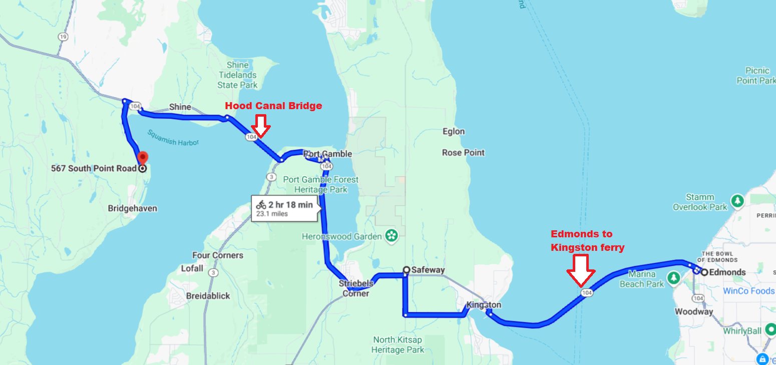 This map shows our route from the Edmonds ferry, across the Hood Canal bridge, to our AirBnB stay for the first night.