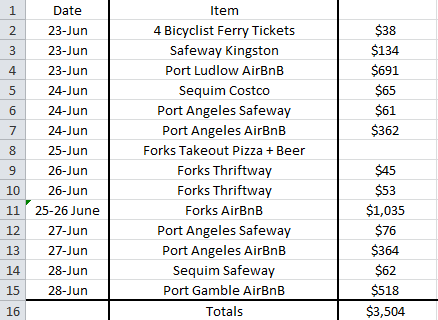 After riding through downtown, we got onto the famous Burke-Gilman bike trail and rode home. June 29 photographs June 29 video Here is the final tally for all the money spent on this trip. Less than $900 each, plus plane fare. It turned out that we only had to pay for the