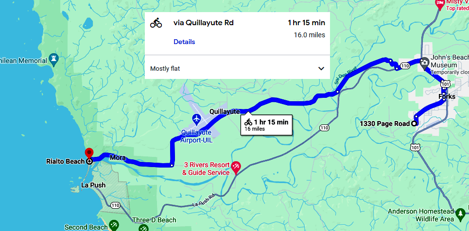 Wednesday June 26 2024ForksRide 2 1/2 hours, 32 miles, + 574' elevation from Forks to Rhialto Beach and back to Forks Second night in Forks AirBnB |