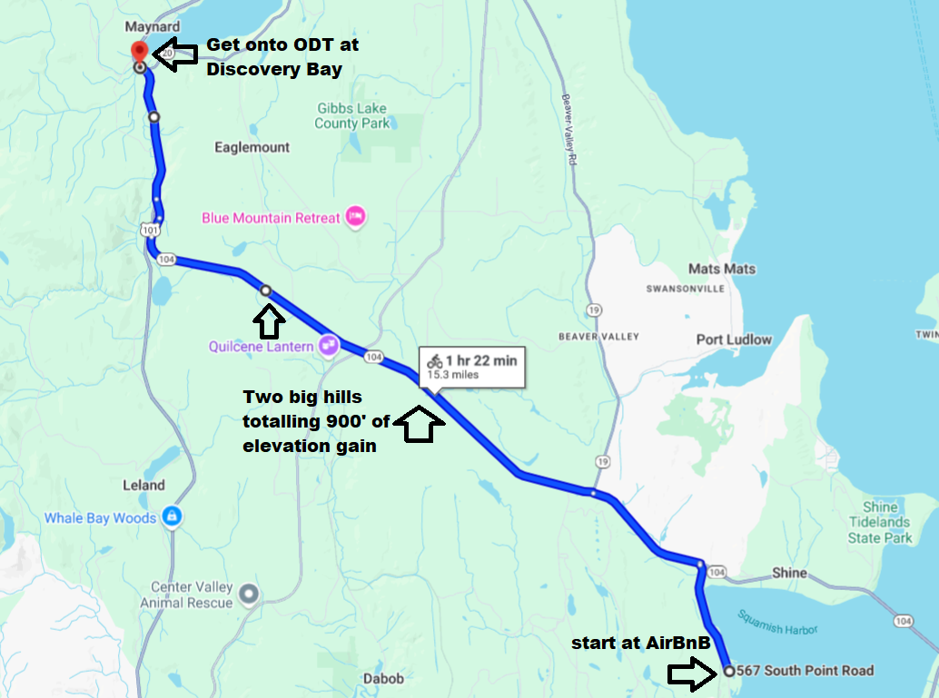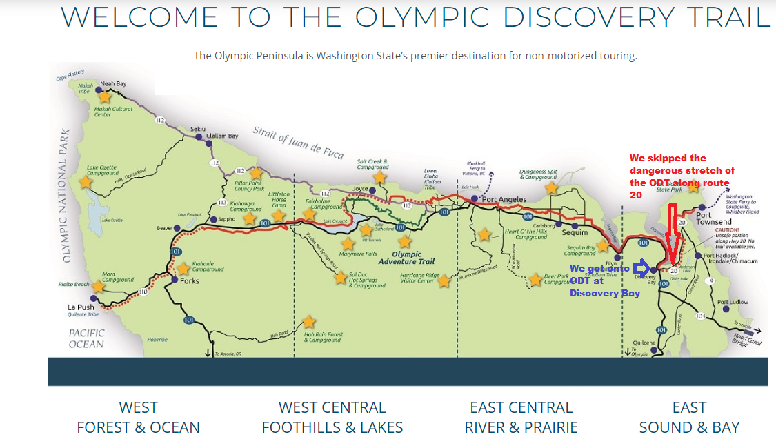 We are skipping the unsafe portion of the ODT which goes along Highway 20 on the eastern end. Instead, we come up from Hood Canal and join the ODT where it turns into a bicycle trail.