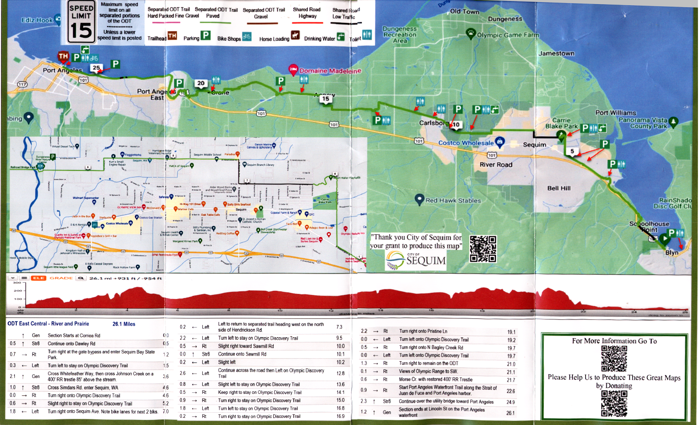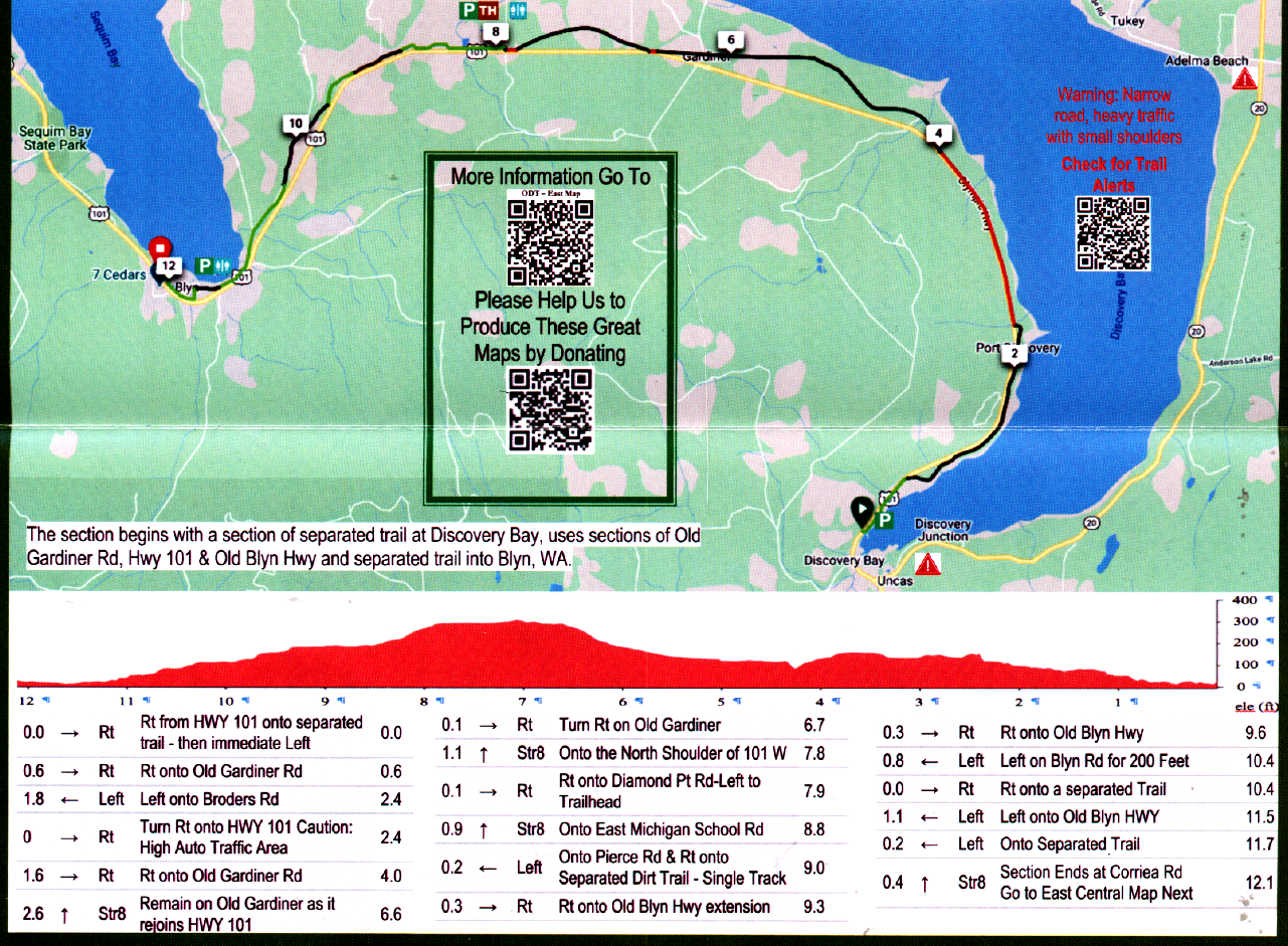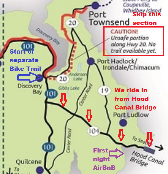 The next map shows the ODT route that we took into Sequim. This section is mostly on dedicated bike trail, which was nice. (The map also shows the warning that Rte 20, on the east side of Discovery Bay, is narrow and dangerous and should be avoided, which is why we