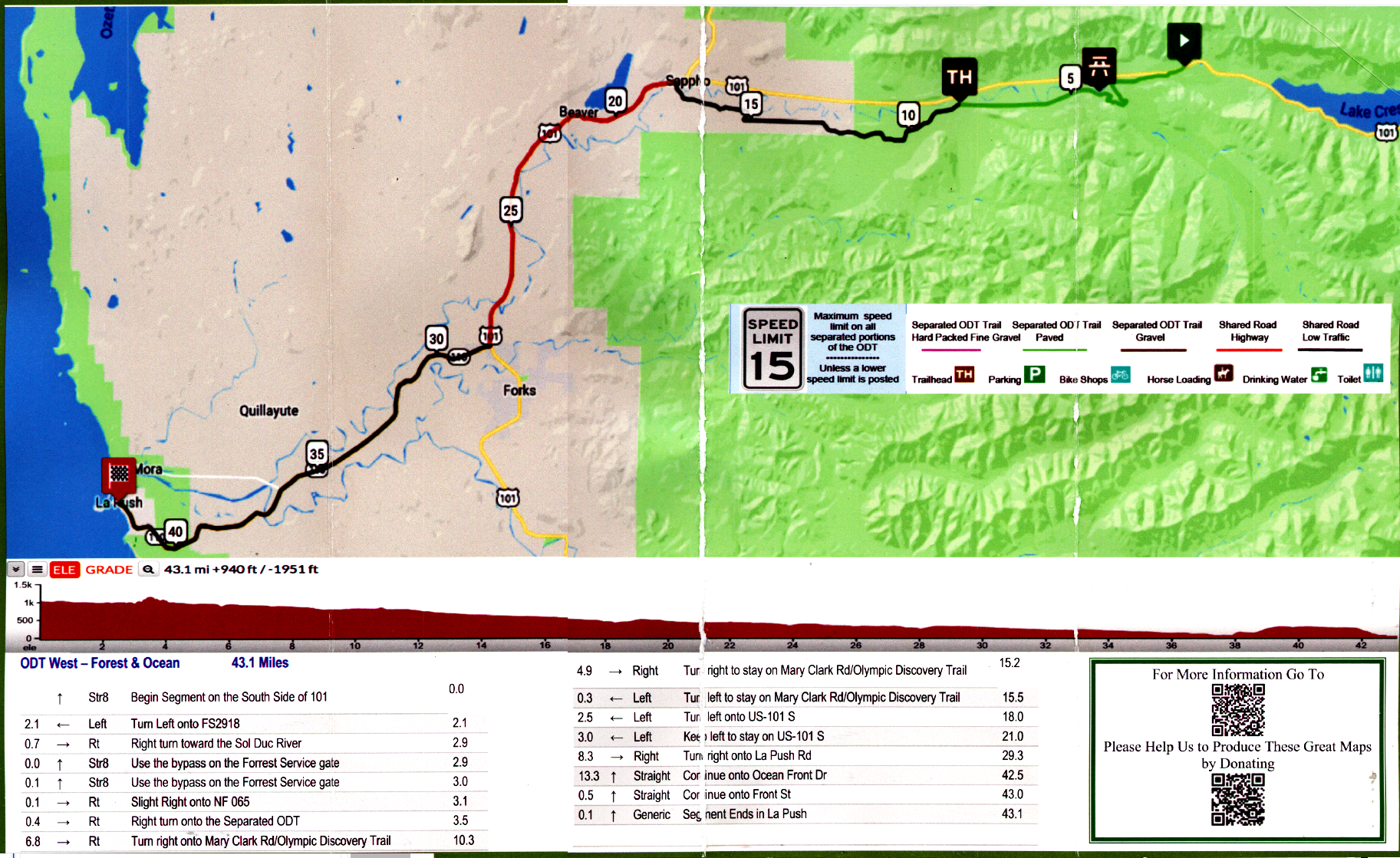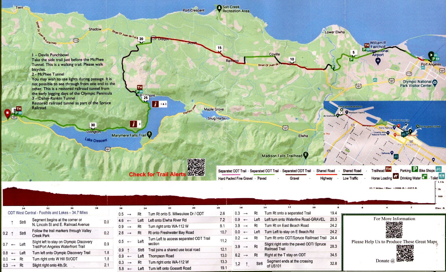 June 25 maps As the color coding on this map reveals, we had to ride on the shoulder of some roads leaving Port Angeles. But once we reached the shore of Lake Crescent, we were again on dedicated bicycle trails.