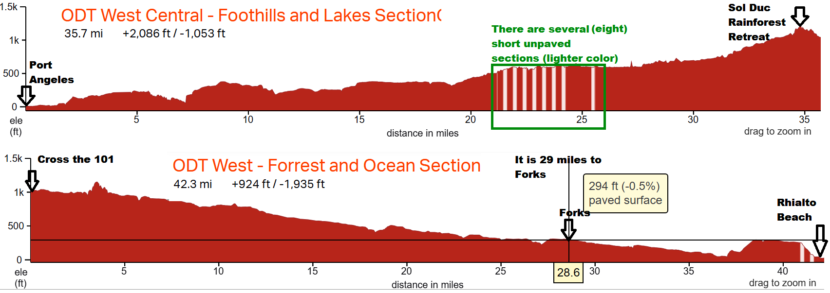 This first shows the ride to the halfway point to Forks; the ODT crosses the 101 on the far left of the map. Here is the second half of the route, showing the ride to Forks and then all the way down to the Pacific shore. We stopped in Forks. This profile plot shows that the ODT climbs leaving Port Angeles until the 101 crossing, and then descends down to Forks and Rhialto Beach. June 25 photographs June 25 video Today was our rest day. We hung around the AirBnB all morning because the forecast said that the morning rain might lessen by the