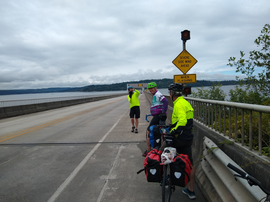 The first part of today's ride was less than ideal. We rode along WA-104 at the start. This is a busy highway with a lot of noisy traffic, but fortunately it has wide shoulders so we were several feet away from cars and trucks, on the other side of rumble strips. It started to mist soon after we started. The mist turned to a light drizzle, which increased to showers. The weather radar had shown no rain that morning, but it was raining upon us anyway. I foolishly didn't bother to put on my raingear, I figured I was soaking wet already. I was lucky I didn't get hypothermia. But we were generating a lot of heat riding on WA-104 and then 101 - there were two big hills we had to climb, about 900' of gain in all.