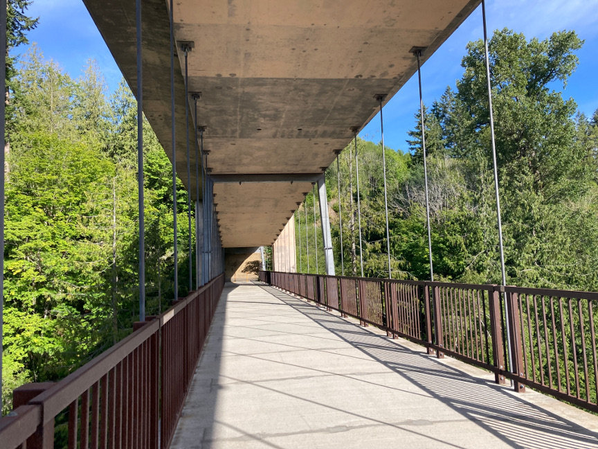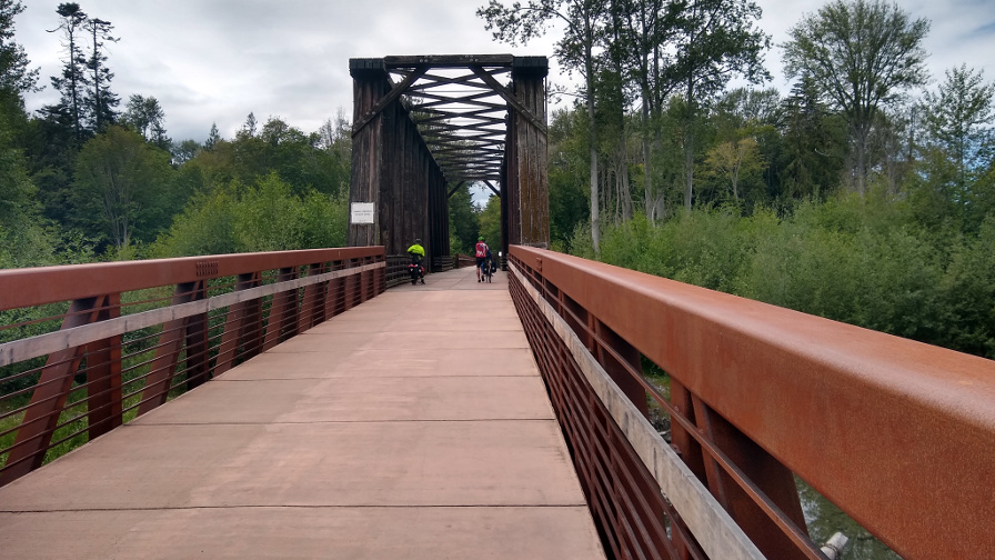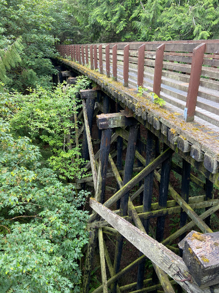 Leaving Sequim and riding west, we soon came to Railroad Bridge Park. This park has preserved one of the nicest railroad trestle bridges. It crosses over the Dungeness River.