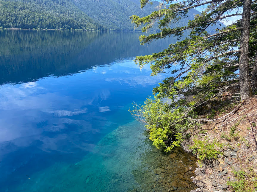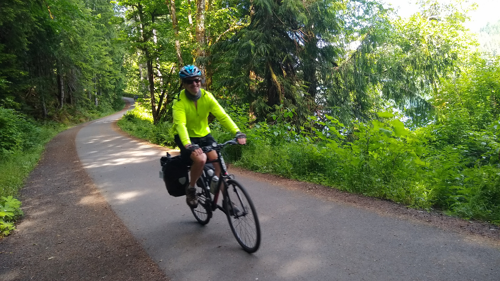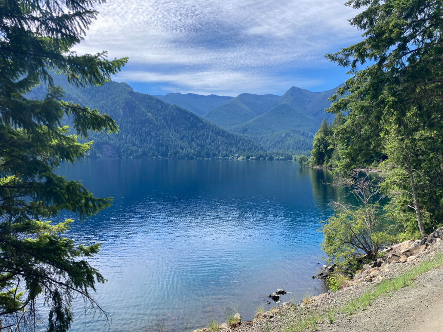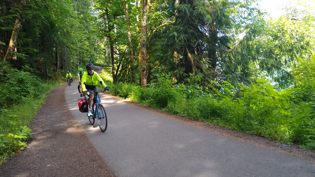 in at the Blackberry Cafe for coffee, and then - properly fueled - took a low-traffic road up and over a hill that put us at the entrance to the Lake Crescent trail (this section of the ODT is called the Spruce Trail). The north shore of spectacular Lake Crescent is a paved bicycle trail. With the sunshine we enjoyed, the scenery was terrific as we rode along. This was my favorite portion of the