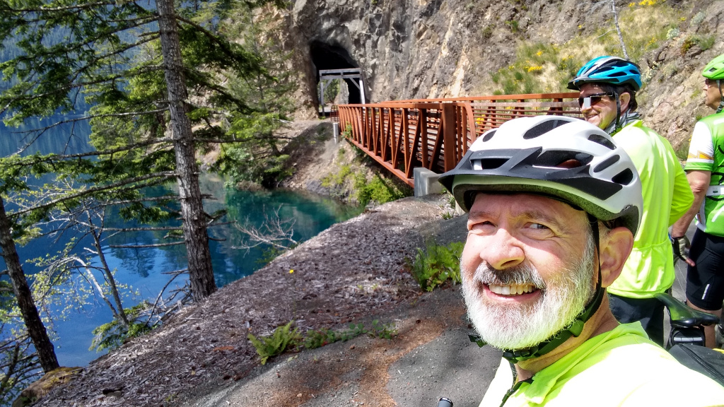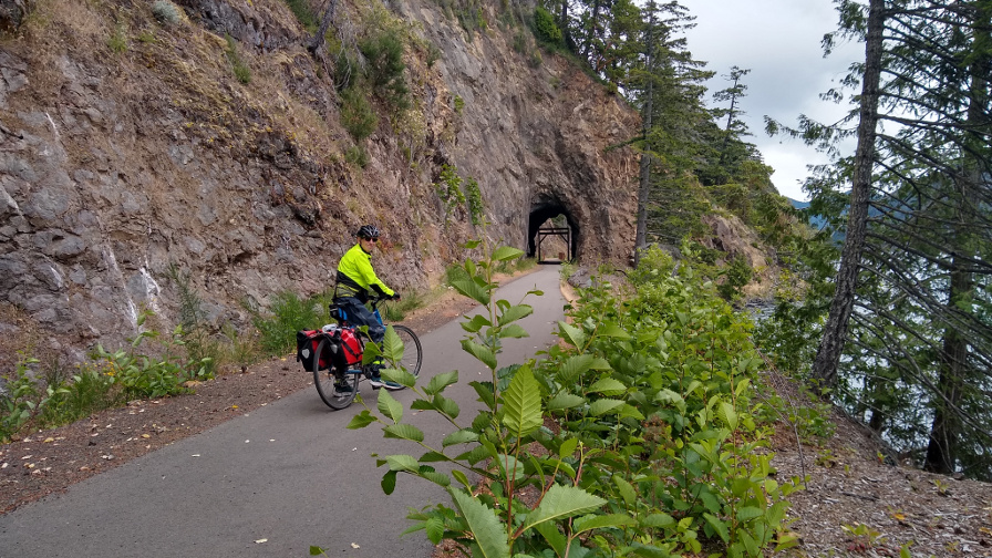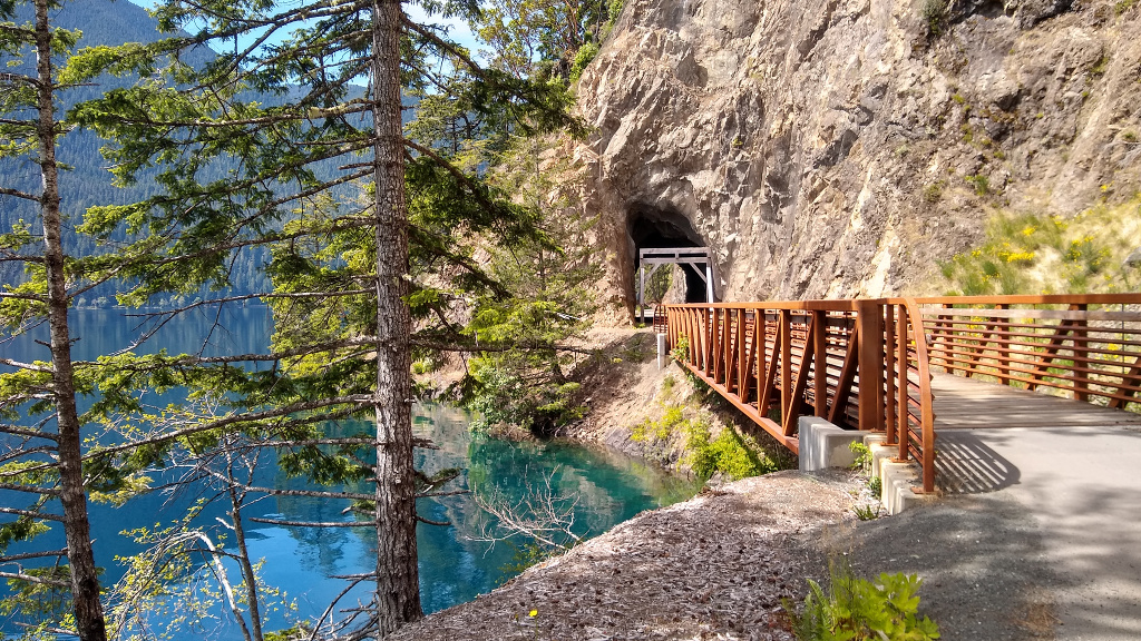 entire trip. The lake water was a gorgeous turquoise color, and there was no wind, so no ripples disturbed the surface. There are two short railroad tunnels along the bike trail before it begins a long steady climb up a shallow grade. There