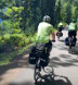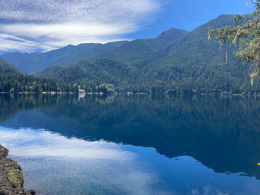 the way as I rode along Mary road, and then on the paved ODT trail through the forest. I crossed the 101 and reached the picnic table. Lance, Ramone and Keith caught up just five minutes later. After lunch, we rolled down the Spruce Trail to Lake Crescent. I was surprised at how long a downhill the slope was; it didn't seem like so much of a climb coming