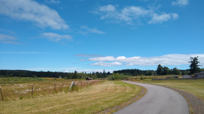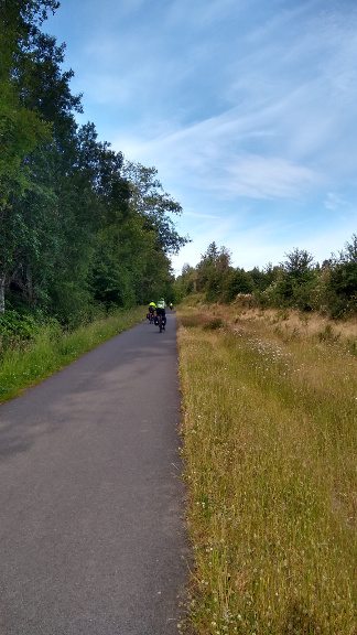 Once we got to Discovery Bay, we found the entrance to the Olympic Discovery Trail, and then we were riding a paved bike trail, well separated from the traffic. Even better, the rain stopped after that point, and I dried out as we rode along. We met a 79-year old cyclist who rode along with us for a good ways. He told me that he used to be a bicycle courier, delivering pizzas. Now he was riding to Sequim for a dentist appointment.