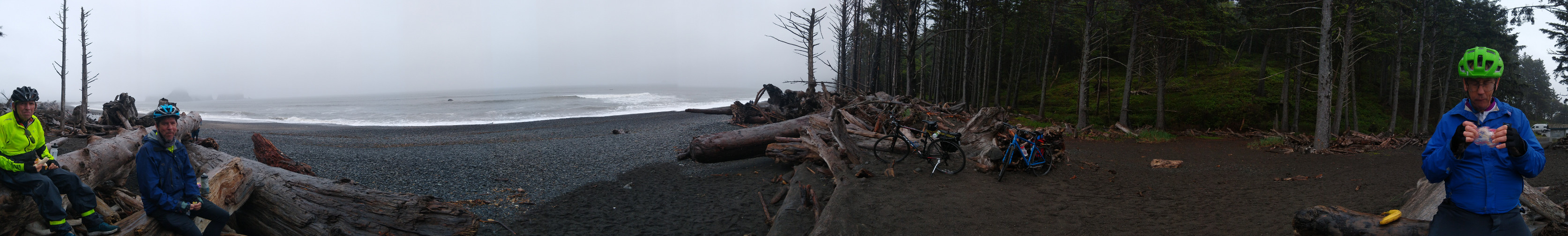 get far before the light rain picked up. For the rest of the day this light drizzle continued to fall. We took a group photo at the Olympic National park entrance sign, then pedaled down to the shore. A thick grey mist hung over the Pacific