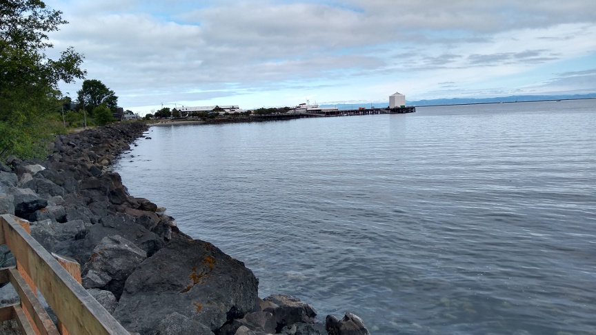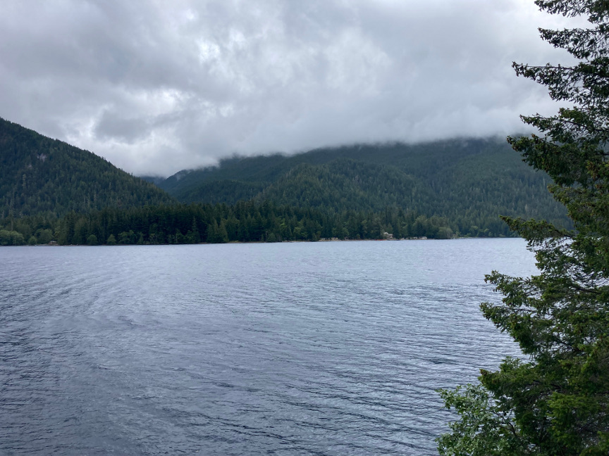 up from the lake shore. We quickly found ourselves back down at the lake shore, but today the wind was blowing, making big waves across the lake, and the overcast skies made the lake water look dark. We were almost back to the Port Angeles AirBnB when my front tire got trapped in a rut in the road. The handlebars spun violently and pitched me over the top. I got some