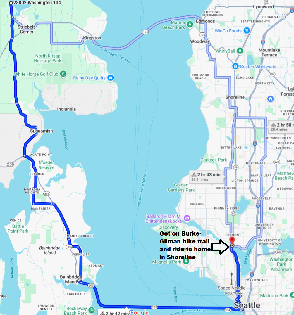 Saturday June 29 2024ShorelineRide 4 1/4 hours, 44 miles +1660' elevation to Shoreline via Bainbridge Island Catch Bainbridge Ferry back to Seattle |