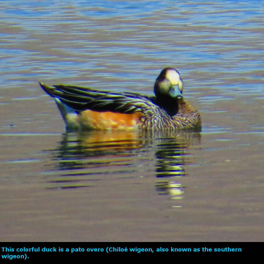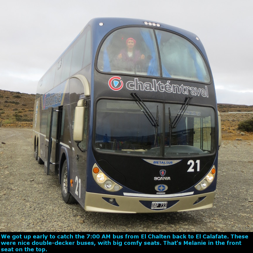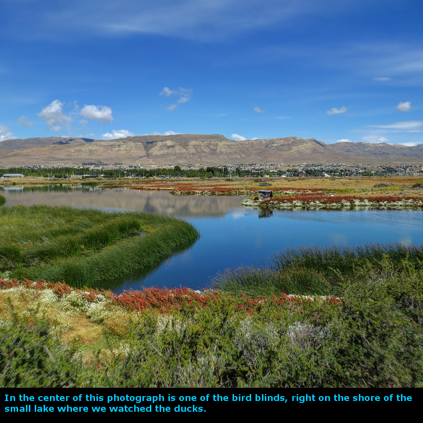 We woke up early this morning so we could catch the morning bus back to El Calafate. Since we were the first people to board the bus, we were able to claim the front seats on the top deck of the double-decker bus. But unfortunately there was a light rain that morning so we couldn't really see out. We were back in El Calafate by noon. We returned to Posada Karut Josh for one last evening, dropped off our bags, and headed into town. We had the whole afternoon free, and the weather had turned sunny and bright. I wanted to head down to the Laguna Nimez Reserve, which is on the north side of town. I had seen a brochure showing flamingos, and I thought it would be neat to see wild flamingos. Laguna Nimez Reserve is a bird sanctuary. It has two large pools and a marked trail that circles them. There are two bird blinds, where you can sit and observe the birds while remaining hidden from them. There are also two open platforms for bird watching. The official guide suggested planning 1 1/2 hours for a visit, but we stayed much longer that. I kept thinking how much my mom would have enjoyed a visit like this - she could have brought her super long lens and taken some really great shots of those birds. The star of Laguna Nimez is certainly the Austral Flamingos, also called Chilean Flamingos. There were plenty of flamingos present, but unfortunately we couldn't get that close to them. We did have our binoculars and the zoom lens on the cameras. We watched as they took off and landed - they are so distinctive in flight, with their long necks stretched out in front and the stilt legs trailing behind. In addition to the flamingos, we saw hawks, geese, ducks, coots, swans and some smaller birds. The meadowlark was perhaps the most colorful bird that we saw. (There are supposed to be blue/white Chilean swallows present, but we did not see any of them). When we left the reserve, we happened upon a pair of blackfaced ibis feeding on a lawn. For dinner, we went to an establishment called La Tratto. Because Argentina is famous for its beef, I ordered a steak. Melanie got a Hawaiian pizza. We used up the last of our Argentinian currency, which we were happy to get rid of, because the US banks will not exchange Argentinian pesos back into dollars. After our big dinner, we walked to the entrance of El Calafate to get some photographs of the welcoming signs. Then it was back to Posada Karut Josh for some packing - it was our last night in South America, the end of a great trip. Panorama Photos