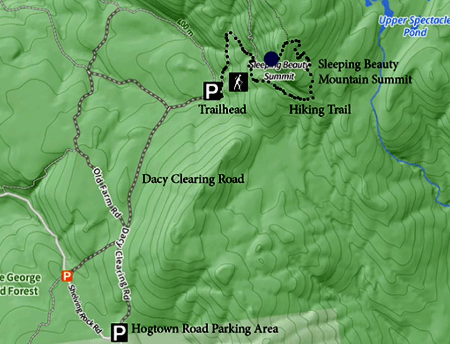 Sleeping Beauty Mountain is a 1.8-mile hike from the Dacy Clearing Road parking lot and trailhead. Sleeping Beauty is located ln public Forest Preserve in the Lake George Wild Forest area on the east side of Lake George in Washington County. This is a short, but rugged and steep hike over the well-worn and heavily eroded trail. At times, the gate at the entrance of Dacy Clearing Road is closed, and hikers need to park at the Hogtown Parking Area, which adds about 3 miles onto the hike’s length.