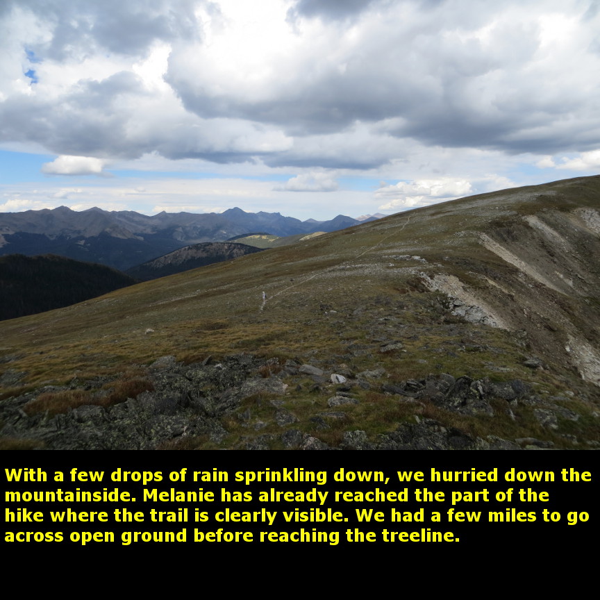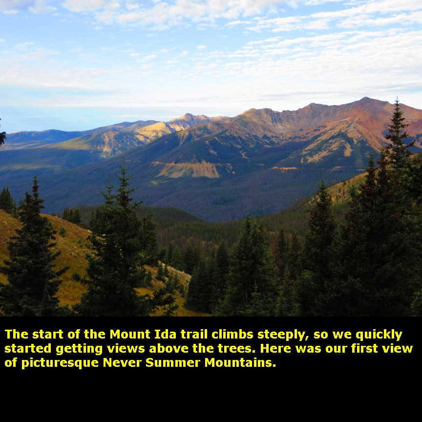 climbing quickly gets you up above the treeline, and for the rest of the hike you get wide ranging views in all directions. The Never Summer Mountains are directly to the west and were nicely