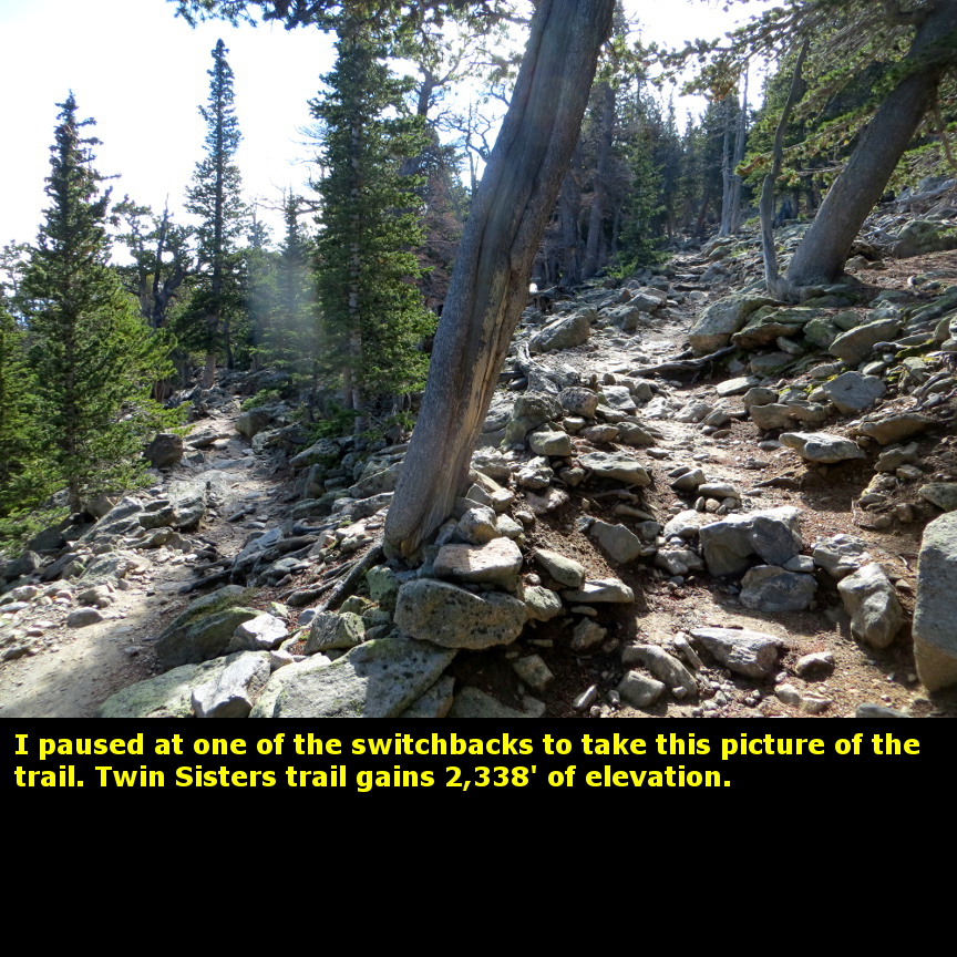 I took this picture of the Twin Sister trail map from the sign board at the start of the hike. This map clearly shows how the trail moves between Rocky Mountain National Park