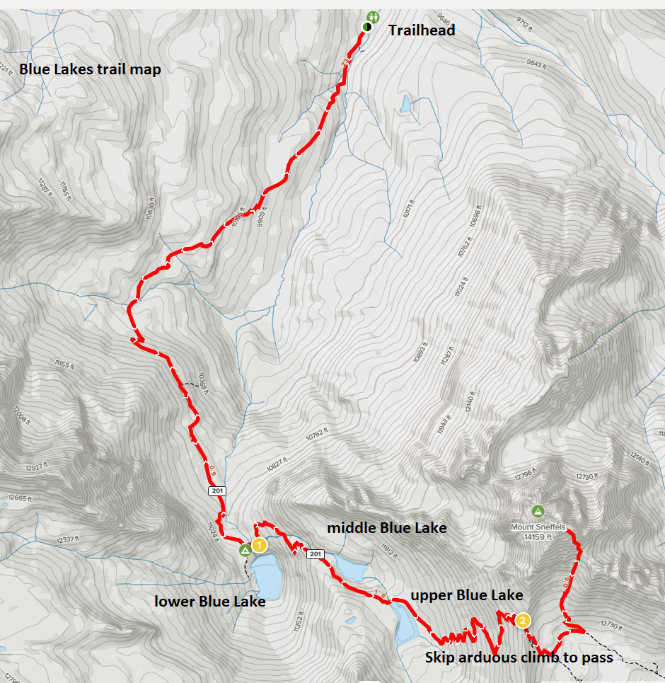 There are some spectacular views from above Lower Blue Lake. A short distance after that, we saw Middle Lower Blue Lake, and then soon reached Upper Blue Lake. We spent about twenty minutes here, eating a bit of lunch and admiring the cirque. On the hike back down, we caught up with Ed and Suz, so we all walked together back to the start. That evening, Melanie and I got an order of fish and chips from the Goldbelt restaurant. It was a nice ending to a perfect day. I copied the map and trail profile from the Hiking & Walking Blue Lakes website