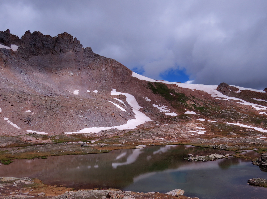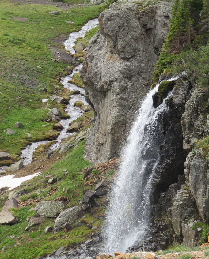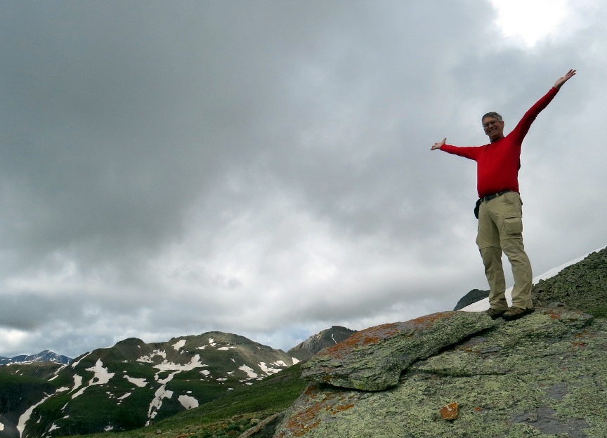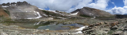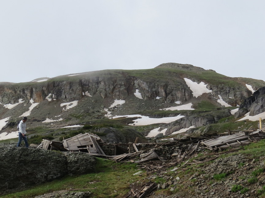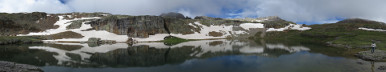 Ed came with us on this hike, while Rayden and Suz went off on a horseback riding adventure. We started hiking at just after 7 A.M. We always like to get early starts - it makes it more likely we will get a parking spot, and we have found that thunderstorms are more likely to occur in the afternoons. The toughest part of the hike is the first section, when there is a lot of climbing. But after we got up around a bend and entered Porphyry Basin, the trail leveled out and the views leveled up. It is a scenic environment. Ed was keen to explore the abandoned mines. I saw him picking up golden nuggets and stuffing his pockets full of treasure! Since this land is not a National Park or a National Monument, it is okay to take home souvenirs. Ed probably collected a couple pounds of golden momentos. We marveled at the unnamed lake, and ate lunch while looking at Porphyry Lake. Then we hiked up to the South Ridge Overlook. We spent time enjoying the expansive vistas. Melanie's watch said it was 11:15 AM while were on top of the ridge. I tried using the PeakVisor website from on top of Three Needles to see if I could identify some of the many peaks that appear in these vistas. Some loud fighter jets came zooming low over the mountains. There must be an airforce base nearby. We met another couple on the jeep trail, and they suggested the Columbine Lake was a great hike, and also Bear Creek Falls. We will try for one of those trails tomorrow. A light rain started falling as we hiked the last mile to the car. We finished at 1:30 P.M. We had ice cream for dinner! I took a lot of panorama photos on this hike. At this high elevation, we got plenty of dramatic views in all directions. This was perhaps the most scenic hike on our trip. I copied the map and trail profile from the Hiking & Walking Porphyry Basin website