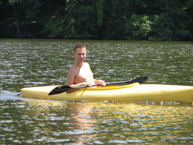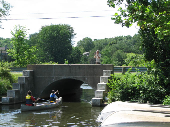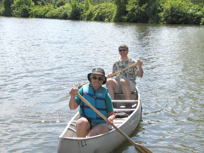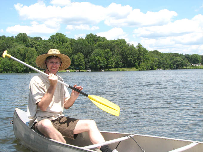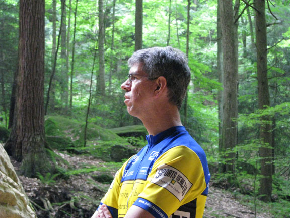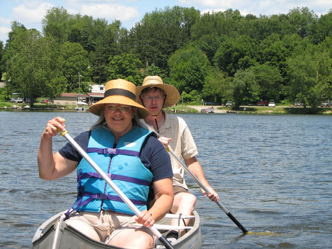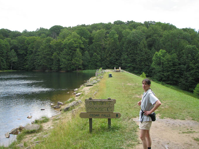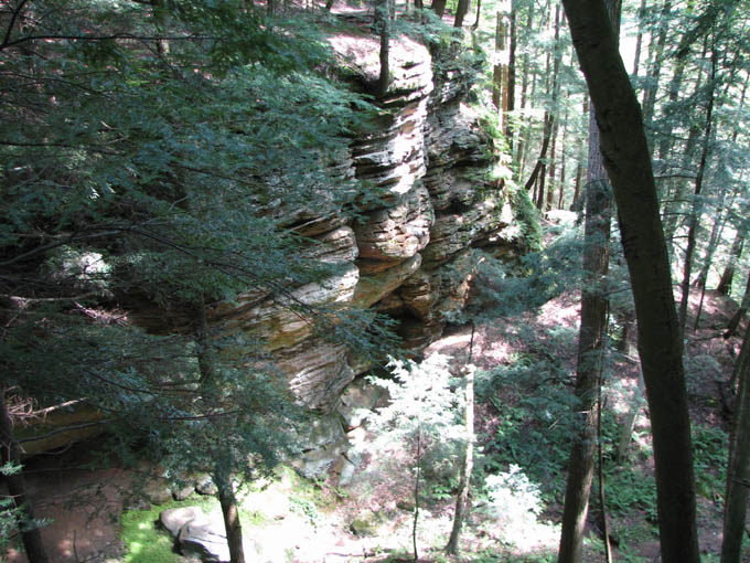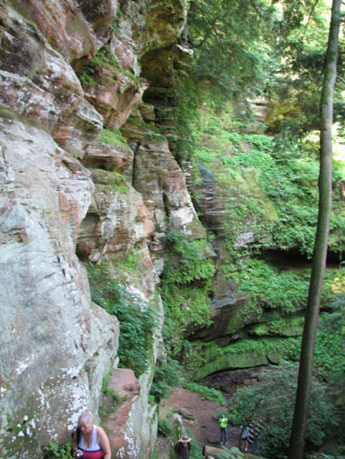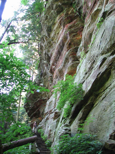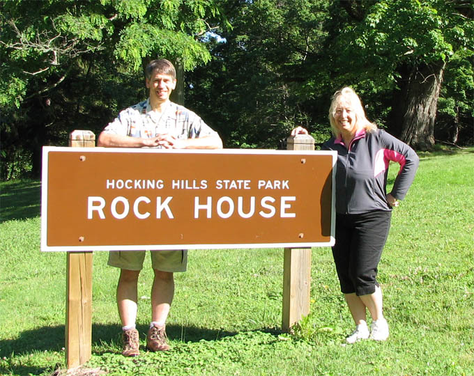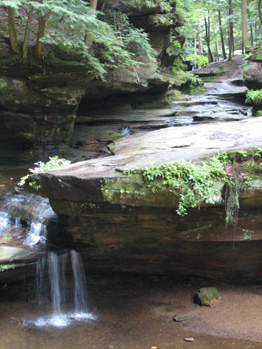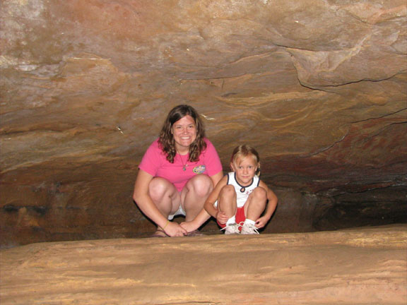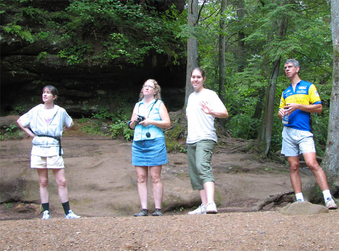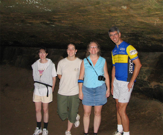 For a family reunion, my sister rented three large cabins in Hocking Hills State park for a few days at the end of June, 2008. My mom was there, my sister Louise and her husband Joe and their daughter Laura. My sister Rose was there with her sons Kevin and Nick. My sister Lil was there with her daughters Katie and Molly. And my brother Ed was there with his wife Suz and their son Joe. A pretty good crowd. The first thing we did (after breakfast) on the morning of the first day (June 30th) was drive to Ash Cave. The rim trail leads up and over Ash Cave, so we did that first. Then we hiked back down to the level of cave entrance and took some more photos. Technically, Ash Cave is not a cave at all, it was formed by erosion of softer rock out from beneath the hard top rock layer. In fact, only the Rock House in Hocking Hills is a true cave. Old Man's cave, Cantwell Cliffs - these are just over hanging cliffs. The top of the cliff at Ash is 90 feet from the bottom. A small waterfall trickles down in the center. I wonder if the falls volume increases dramatically greater during the spring melt. We explored around the cave, and then we drove off to Cedar Falls. Cedar Falls is not impressively tall, but at least there was water flowing. Hard to believe there was enough volume of water flowing to power a mill at one time, or did the settlers only grind their corn and wheat after rain storms? At Cedar Falls we decided to split up. One group would drive over to Old Man's Cave, the other party - Melanie, Ed, Suz, Laura and I, would hike the Buckeye trail to Old Man's Cave. It is only a few miles between Cedar Falls and Old Man's Cave, so we didn't figure it would take too long. Hiking would allow us to see more of the park. We took the low route, through the bottom of the gorge. Just after we started, it began to rain, so we found an overhanging cliff to hide under. The rain was not drenching, and it soon tapered off. Old Man's Cave is a pretty neat area. It has a network of trails over bridges, through tunnels, into caves, and up to waterfalls. A great place to explore. There is a rock formation that is supposed to look like the head of Sphinx - if you squint really hard and use your imagination; I found the Sphinx easiest to discern if I closed my eyes completely. There are two real water falls: the Lower Falls and the Upper Falls. The Middle Falls is more like a cascade than a waterfall. One pool of water is called The Devil's Bathtub. I don't know where it got that name, perhaps it is too hard to climb out of once you get into the water, and then the Devil grabs you and drags you under. We took the higher trail on our way back to Cedar Falls - we walked along on the top rim of the gorge. The upper trail crosses over the dam which creates Rose Lake. Back near Cedar Falls, the trail crosses the gorge on a suspension bridge. On our second day of visiting Hocking Hills, we went to see the Rock House. The Rock House is a big cave in the side of a cliff. It once was used by Native Americans, and then for a while as a hangout for bad guys. It seemed like a wet place, and with big "window" openings in the cave walls, it would have been pretty cold and drafty. It was a fun place to visit, but glad I don't have to live there. Just down the road is Conkle's Hollow. The Hollow is a gorge in the sandstone cliffs. The cliffs are as tall as 200 feet, but it is a bit hard to see these impressive rock walls because of the dense vegetation. First we did the trail that goes around the top of the cliffs, and then we went down the steps and took the short trail that goes right up the center of Conkle's Hollow until it reaches a thin waterfall at the end. There is a "grotto" near the end of the trail, but this is just a small cave." For afternoon fun on the second day, we went canoeing on Lake Logan. There is a boat ramp with canoes for rent. I went canoeing with my mom, we paddled around looking for herons and water lilies. Melanie and Laura got a canoe and made a beeline for the other end of the lake. Kevin went out on his own in kayak, and he went pretty far across the lake too. Louise and Joe took another canoe and went out on their own. It was a nice day, with no wind, so it was easy to paddle around. On the morning of our last day, we stopped at the Cantwell Cliffs. There are a bunch of hiking trails in this area, but we did not explore them all. We just hiked down to the famous Fat Woman's Squeeze (a narrow crack in a huge rock that the path inches through), and got a good look at the Cliffs. Because there is less vegetation surrounding the Cliffs, they are much easier to appreciate than Conkle's Hollow. Take a look at the photographs to see the tiny humans compared to the towering rock walls. We got into to our cars to head home, but we wanted to make one last visit to the Natural Bridge. This is actually pretty hard to find, you have to get off onto a gravel road and drive a short distance. The first half mile of the hike looks like a private driveway in between some farmers' fields. The trail drops about a hundred feet to get down to the Natural Bridge. The Bridge is a slab of rock that once was attached to the cliff, but erosion carved out the softer stone beneath the bridge, and then a big crack fell in, separating the Natural Bridge from the original rock shelf. We walked right across it. It is hard to make out in the pictures because of all the trees, and the lack of clear sunlight. We had lunch at Wendy's and then everyone split up and drove off. The reunion was over, but it was a fun filled three days. All the graphics and photographs are my own, but the textured background is taken from a site, EOS development, that offers non-profit users free use of their graphics. Click below to visit their site. I found the nifty java script for opening and displaying the photographs at a website called Lightbox2. I tried to make a couple of modifications to the java code, but I probably should have left it unto