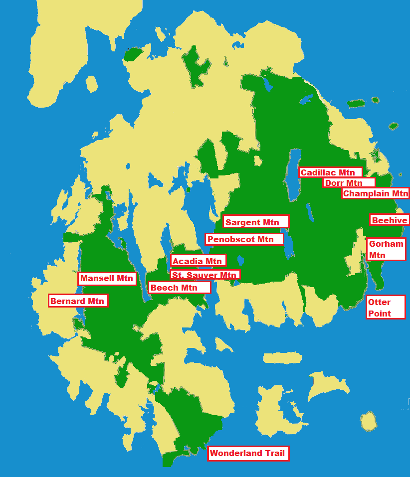 This webpage describes our visit, perhaps it will inspire you to make a trip there on your own! Redeye flight nonstop to Boston. Take off 9:56 PM from SeaTac. Alaska #24 Land in Boston at 6:15 A.M. after 5 1/2 hr flight Pickup Rental Car Drive 5 hrs from Boston to Acadia Acadia Sunrise Motel $99 / night + tax. No breakfast, but room has fridge & microwave. Hiking in Acadia National Park Hike to summits of Bernard Mountain (1071'), Mansell Mountain (938') and Beech Mountain (841') Acadia Sunrise Motel $99 / night + tax. No breakfast, but room has fridge & microwave. Hiking in Acadia National Park Climb the Beehive (520') w/ Lil and Molly Hike to summits of Champlain Mountain (1058') and Gorham Mountain (525') Walk the Ocean Path Acadia Sunrise Motel $99 / night + tax. No breakfast, but room has fridge & microwave. Hiking in Acadia National Park Hike to St. Sauveur Mtn (679'), Valley Peak (530') and Acadia Mountain (681') Walk to Otter Point Acadia Sunrise Motel $99 / night + tax. No breakfast, but room has fridge & microwave. Hiking in Acadia National Park Climb Mt Dorr (1265') and Cadillac Mountain (1522') Walk to the Tarn Acadia Sunrise Motel $99 / night + tax. No breakfast, but room has fridge & microwave. Hiking in Acadia National Park Hike up Sargent Mountain (1373') and Penosbscot (1194') Walk the Wonderland Trail Acadia Sunrise Motel $99 / night + tax. No breakfast, but room has fridge & microwave. Drive 6 hrs from Acadia to Boston Walk sections of the Eastcoast Greenway Trail Return rental car, take shuttle to hotel Hampton Inn $135 / night + tax. Free breakfast, airport shuttle Take shuttle to airport Nonstop flight Boston to Seattle. Take off 11:15 A.M. After 6 1/2 hrs land at 2:30 P.M. Alaska #273 Our trip was a hiking vacation. We had five days in the park, and spent each day on the trails. The map shows all the major sites we visited.