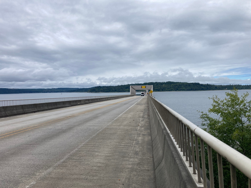 mark of the ride. We picked up some food in Sequim (and also stopped for coffee there). Ramone got a flat as we left town. The two big hills on 104 seemed even higher in this direction. After we rode over the floating Hood Canal Bridge, we stopped for a while in Port Gamble to get some beer. The AirBnB