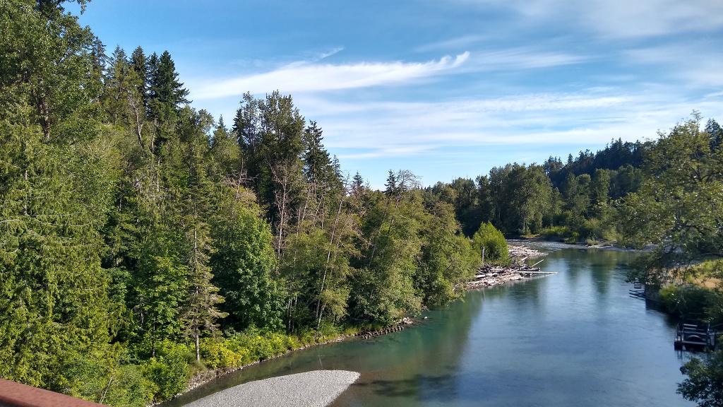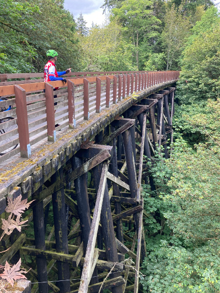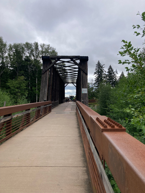 Leaving Sequim and riding west, we soon came to Railroad Bridge Park. This park has preserved one of the nicest railroad trestle bridges. It crosses over the Dungeness River.