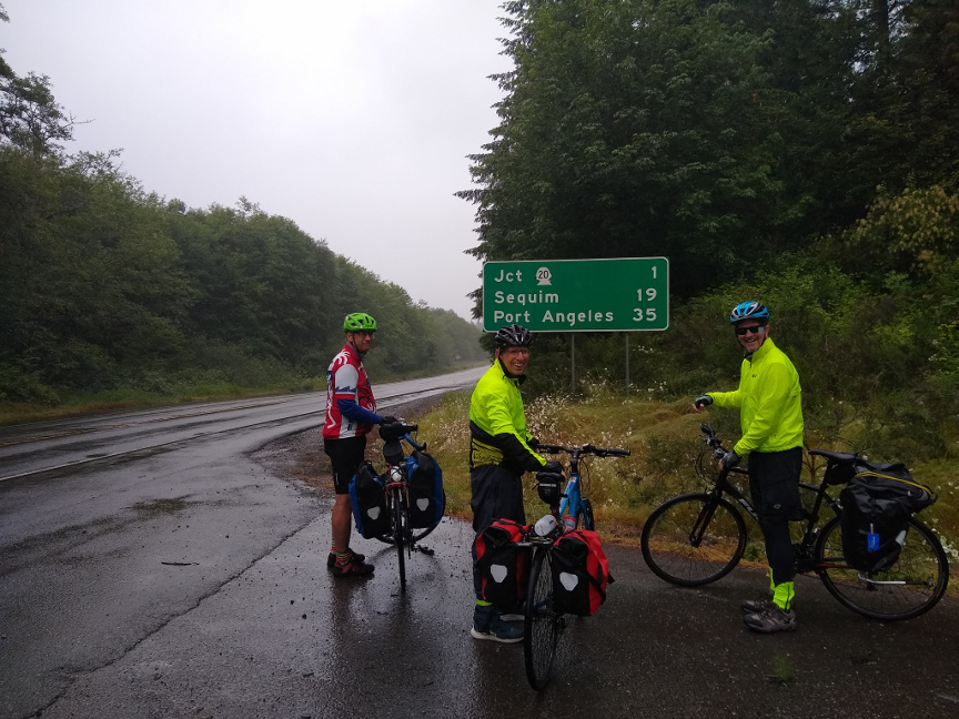 The first part of today's ride was less than ideal. We rode along WA-104 at the start. This is a busy highway with a lot of noisy traffic, but fortunately it has wide shoulders so we were several feet away from cars and trucks, on the other side of rumble strips. It started to mist soon after we started. The mist turned to a light drizzle, which increased to showers. The weather radar had shown no rain that morning, but it was raining upon us anyway. I foolishly didn't bother to put on my raingear, I figured I was soaking wet already. I was lucky I didn't get hypothermia. But we were generating a lot of heat riding on WA-104 and then 101 - there were two big hills we had to climb, about 900' of gain in all.