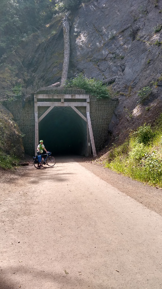 entire trip. The lake water was a gorgeous turquoise color, and there was no wind, so no ripples disturbed the surface. There are two short railroad tunnels along the bike trail before it begins a long steady climb up a shallow grade. There