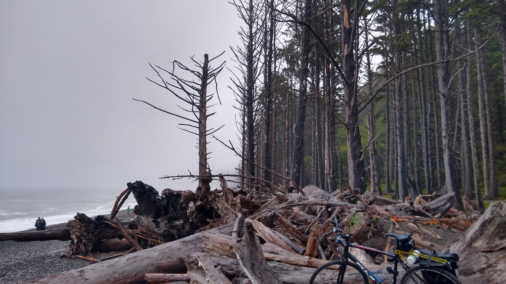 get far before the light rain picked up. For the rest of the day this light drizzle continued to fall. We took a group photo at the Olympic National park entrance sign, then pedaled down to the shore. A thick grey mist hung over the Pacific