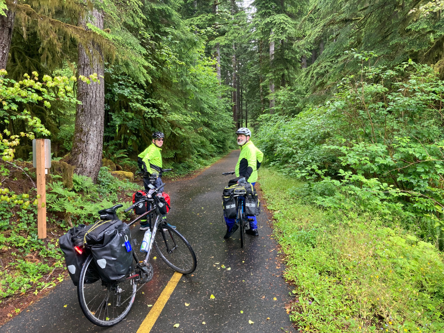 It was quite a surprise to see him in this remote corner of the US. Funny coincidence that we would happen to be at the same grocery store at the same time. We took advantage of the washer and dryer in the AirBnB to clean and dry all of our bike clothes. Tomorrow we start the ride back to Seattle. June 26 maps It was a short trip from the AirBnB down to the National Park and back. June 26 photographs June 26 video It was raining lightly when we left Forks at about 8:15. Our route was the reverse of the ride we did coming into Forks. The first 12 miles were along
