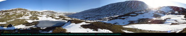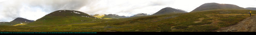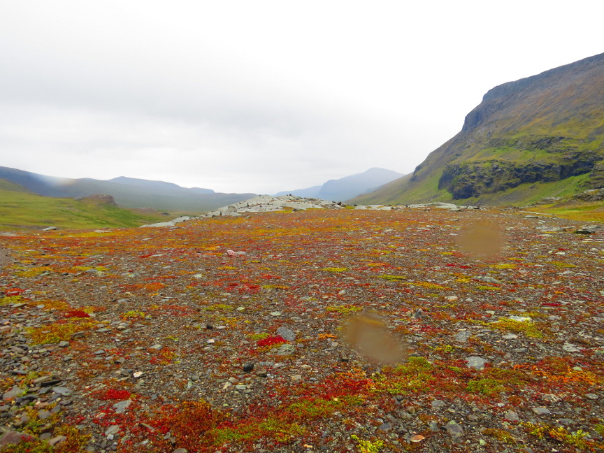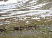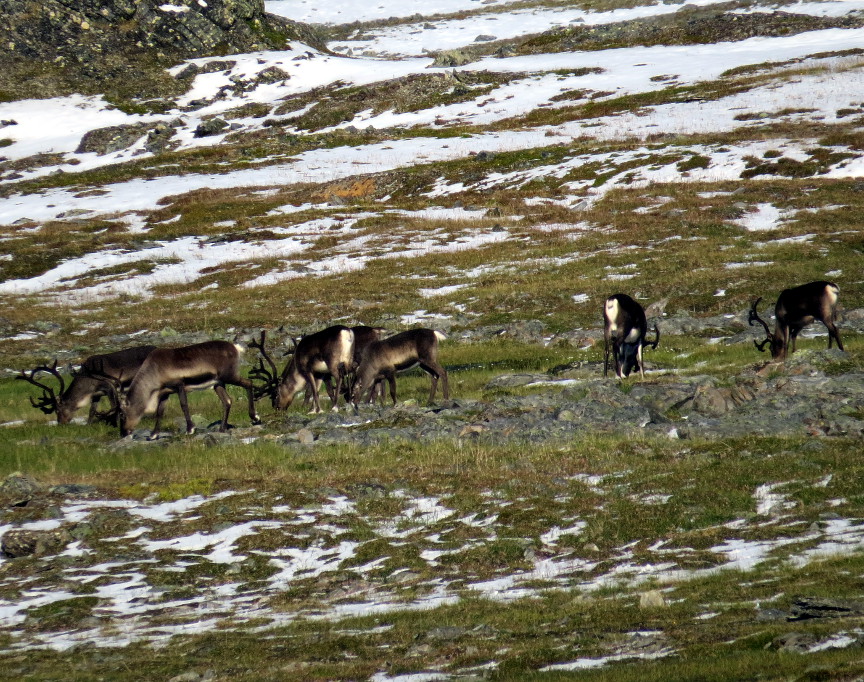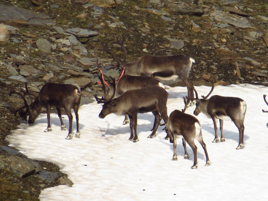 After walking down from the pass, we soon were below the snow line, and found ourselves taking a glorious sunny walk across the tundra. We spotted a large herd of reindeer on the distant mountainside - the day was so warm, the reindeer had congregated on low patch of snow to cool off!