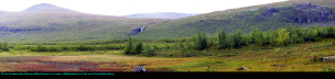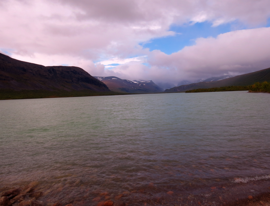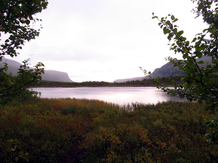 began to lift. The last stretch to Alesjaure is along the shore of a lake, and we started to see more of the famous scenery. Although it did not seem that we had been climbing, the day's hike sloped uphill. We were above the tree line, the open landscape stretched for