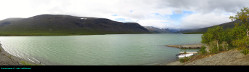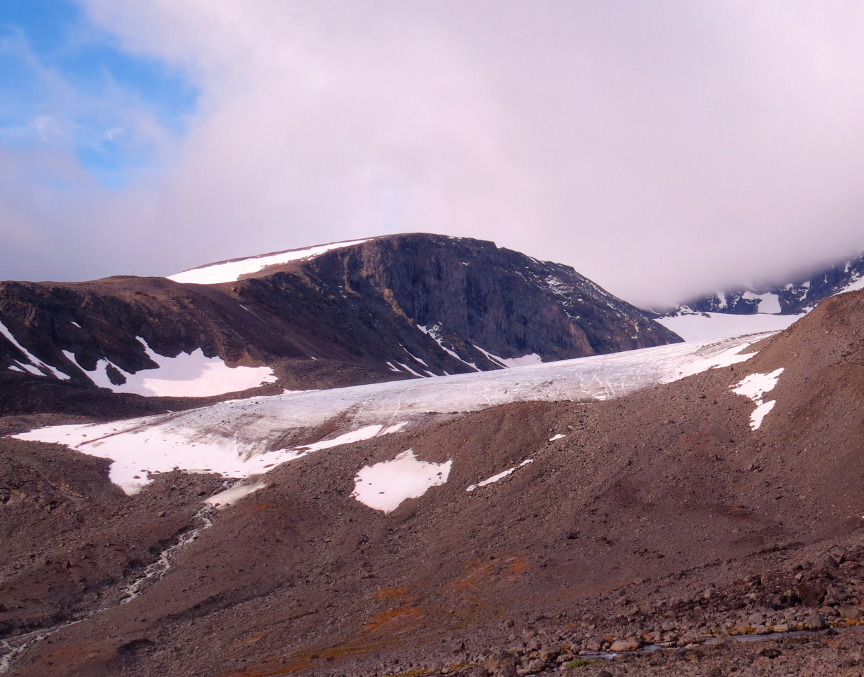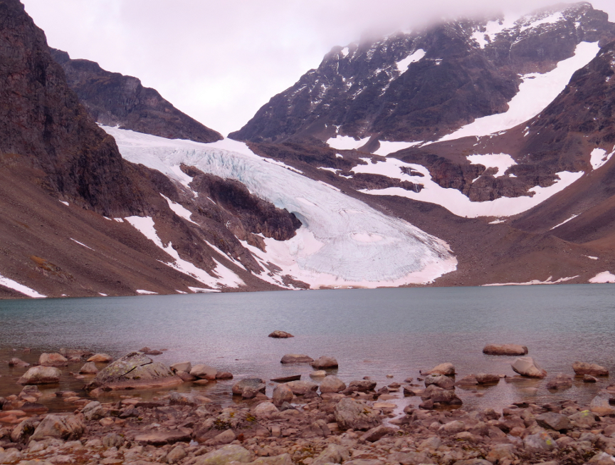 reached the lake shore. The Darfaljavri isn't that big, but it is surrounded by jagged mountains, and a couple of glaciers flow down the mountain. Plus, we briefly saw a rainbow when we arrived at the lake, so that was a nice bonus. It turned out to be windy near the lake, and
