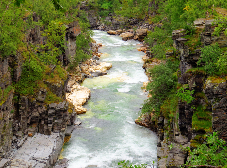 The first few kilometers were along the eastern bank of the Abisko River. Since our hike was in August, the water level at an end of summer low. We followed the course of this river all