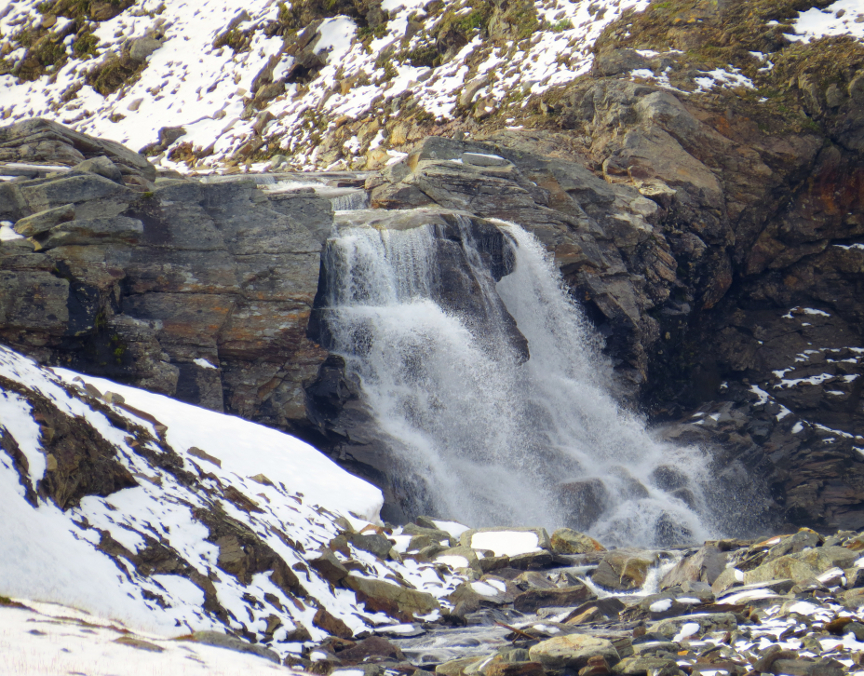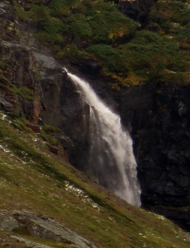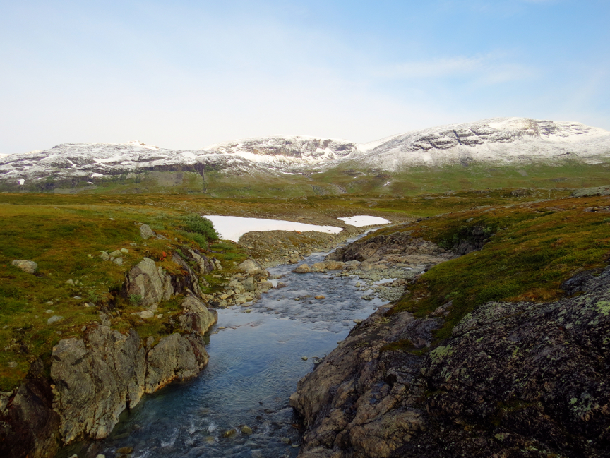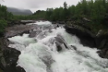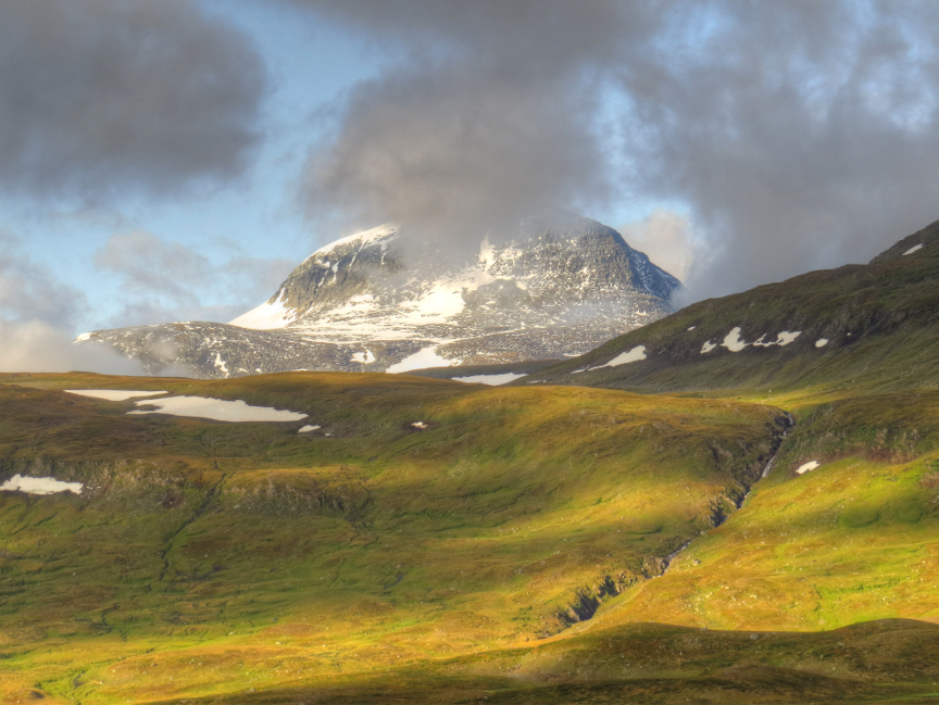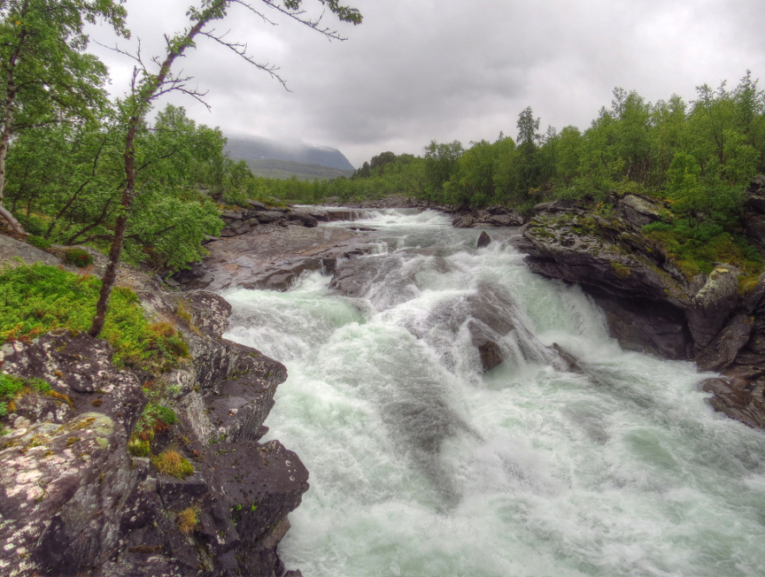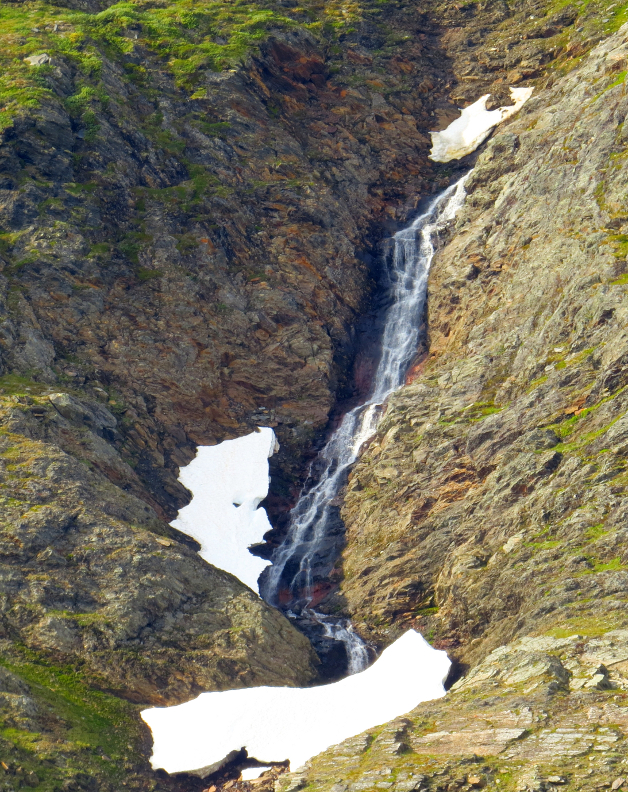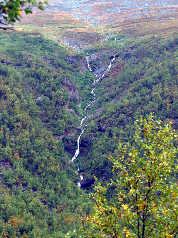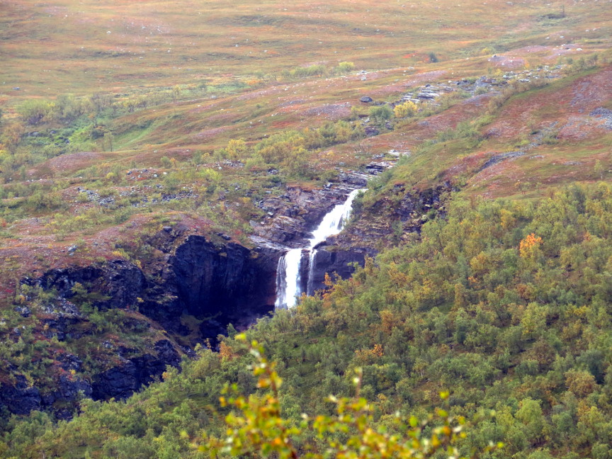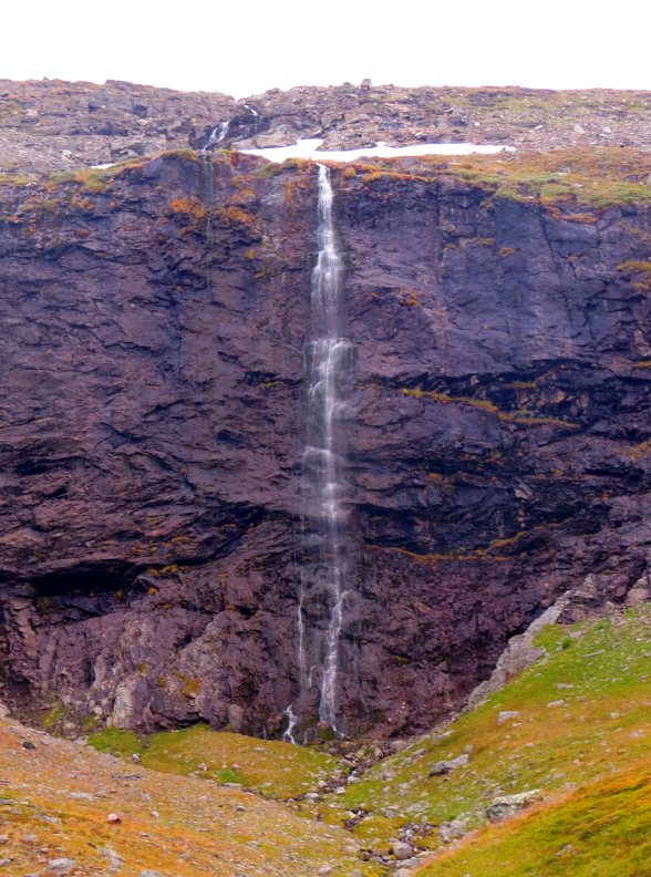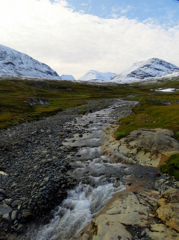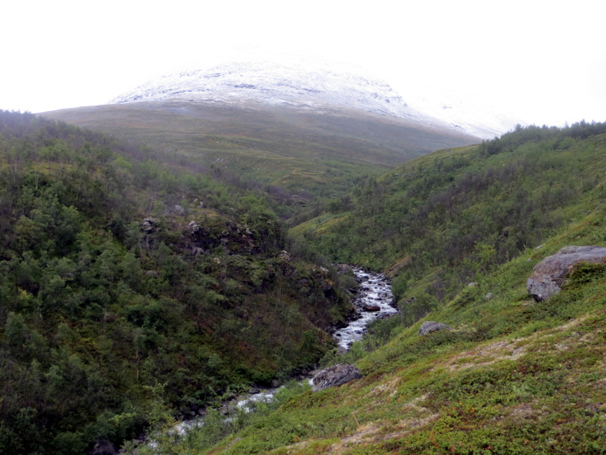 bouncing down the mountainsides from great heights, but we couldn't see the tops of the mountains. The valley widened into a basin. We crossed over a bridge next to a beautiful waterfall. After a bit of uphill hiking, we reached Kebnekaise.