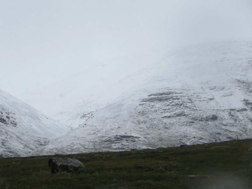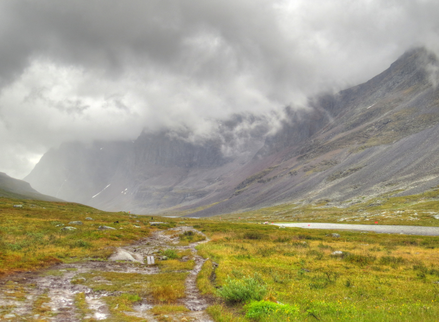 hundred meters high, so walking up it was not a challenge. The rain began to fall as we reached the top of the hill, and it continued as we descended down into the valley that led to Kebnekaise. Everyone slipped several