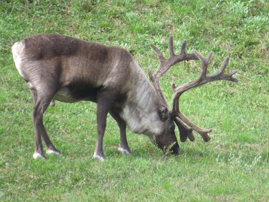 On our way back to the Mountain Station, we saw a solitary male reindeer browsing in a meadow. He didn't seem too concerned by the presence of humans, so we were able to get some up close photographs.
