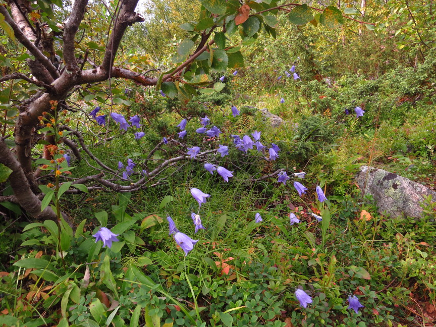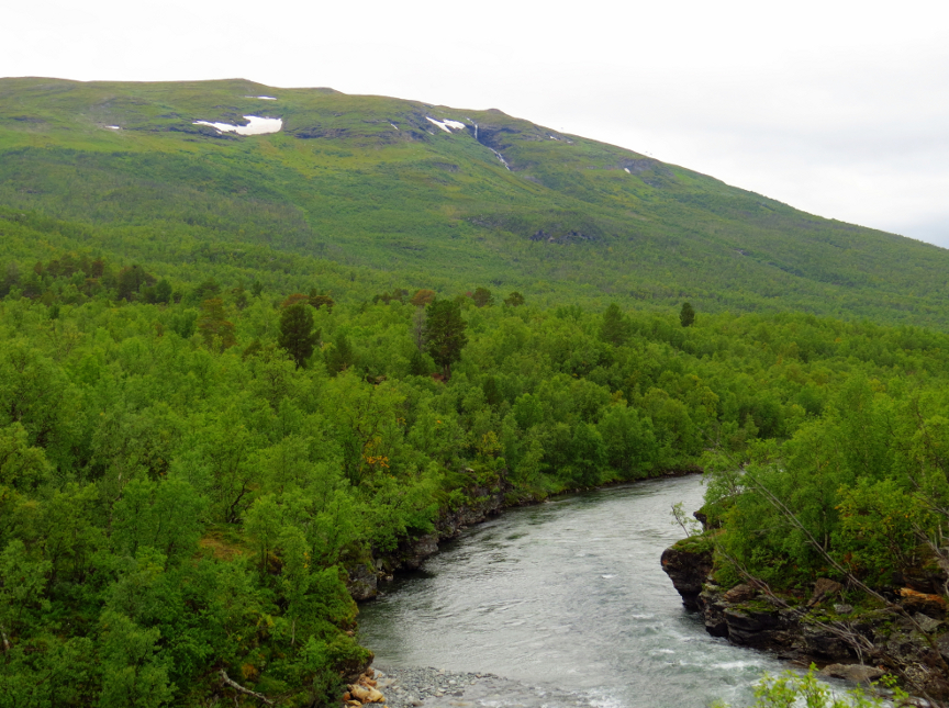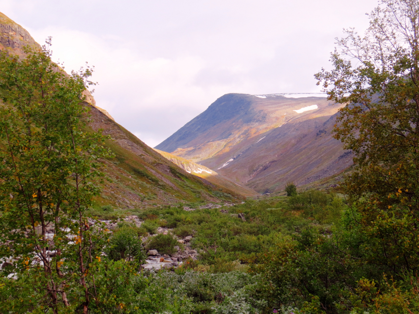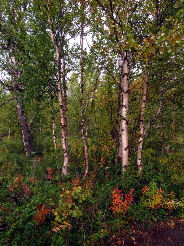 day. At the start of our hike, we walked amongst beech trees in a forest. We were headed gradually uphill all day, and by the end of the day the trees had mostly disappeared. We didn't see trees again until we reached Kebnekaise. We